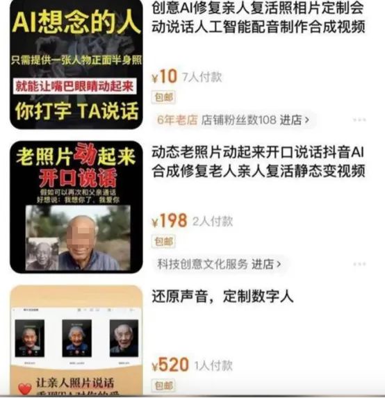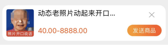 在一些电商平台上少则10元,多则成千上万块,客户只需将去世亲人的照片以及音频发送给商家,就能在几个工作日内得到一个专属的服务平台,有些商家已经售出了超过400单。