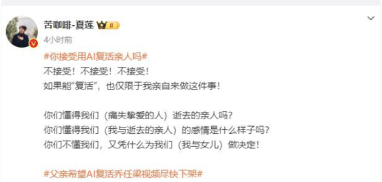 她表示不接受用AI复活亲人!如果能“复活”,也仅限于我亲自来做这件事!