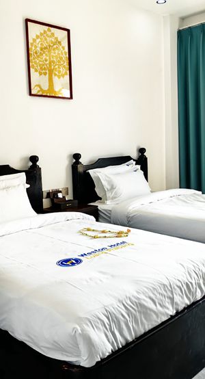 导游先带领大家入住酒店安顿行李。这家酒店是琅勃拉邦最好的酒店。进入房间一尘不染,洗涮用品配套齐全,还提供免费矿泉水、咖啡等。酒店的早餐是自助餐,品种有十几种,大都是中国口味,只有米粉是正宗琅勃拉邦口味。导游特意介绍一定要品尝一下。我们在这里共住了二晚,感觉很是舒心。