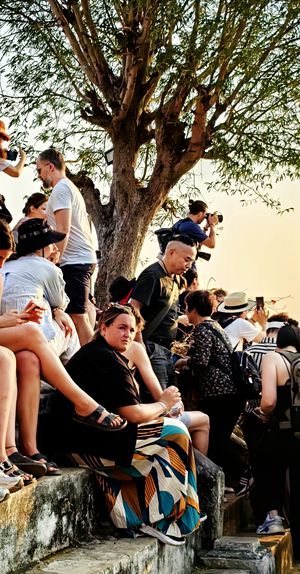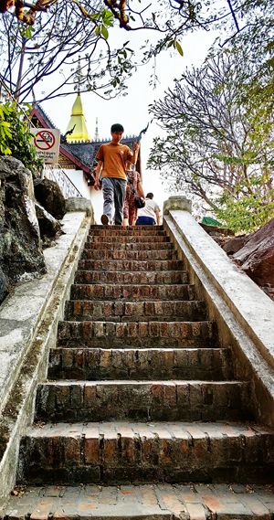 到达山顶一看,不得了,山顶坐满了金发碧眼的老外们,男男女女静静地坐在台阶上,等待太阳落山。琅勃拉邦,浪漫日落,每天傍晚,都会有人坐在普西山上观赏晚霞或日落,这些人大都是游客。这是我看摄影杂志时介绍的场景。来到这里一看,果真如此啊。我穿过密集的人群,绕顶一圈,发现山顶的面积并不大,能落脚的地方有限,如果是旺季,肯定是人挤人。再看山坡上树丛杂乱,适合拍日落的角度很少,这时,太阳离山脊还有一段距离,要等到日落我的时间不充许,我很羡慕那些自由行的人,他们不是为了拍照,而是为了享受一番夕阳的洗礼。