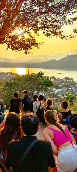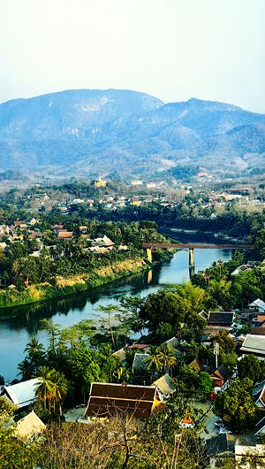 老挝时差比国内晚一个小时,从酒店出来正赶上日落,这个节点登普西山看景最好。普西山是琅勃拉邦标志性景观,它位于琅勃拉邦老城区中心地带,汽车载着我们穿街过巷,也算是观赏了古城风貌吧。当车渐渐驶入普西山,道两侧出现了两条大河,导游介绍这两条河叫湄公河和南坎河。对湄公河 我耳熟,在版纳叫澜沧江,流出国境后被称为湄公河。