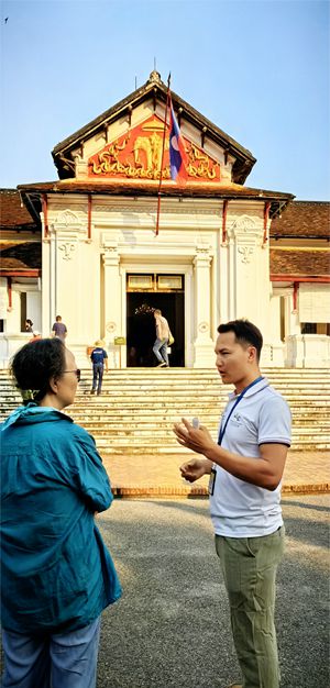 我们的导游是位三十多岁的年轻人,他不喜欢导游这个称呼,让我们喊他小王。小王对工作认真负责,对老年人挺有耐心,态度较好。当火车到达琅勃拉邦时,来了一位老挝导游接站。这位小伙淳朴帅气,他给每位女士带上鲜花项链表示欢迎,我们闻着花香,开启了一段愉快的旅程。