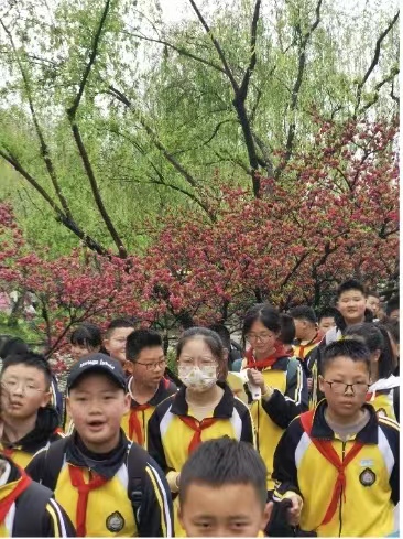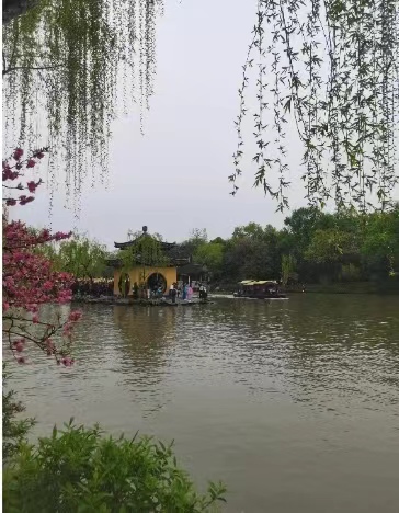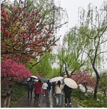 路旁桃花鲜艳,或红或白或红白相间,还有紫荆花和琼花,游客争相拍照;湖边柳条翠绿,时而如钓竿鱼线垂直于水面之上,时而随风微微飘荡如少女轻轻起舞。