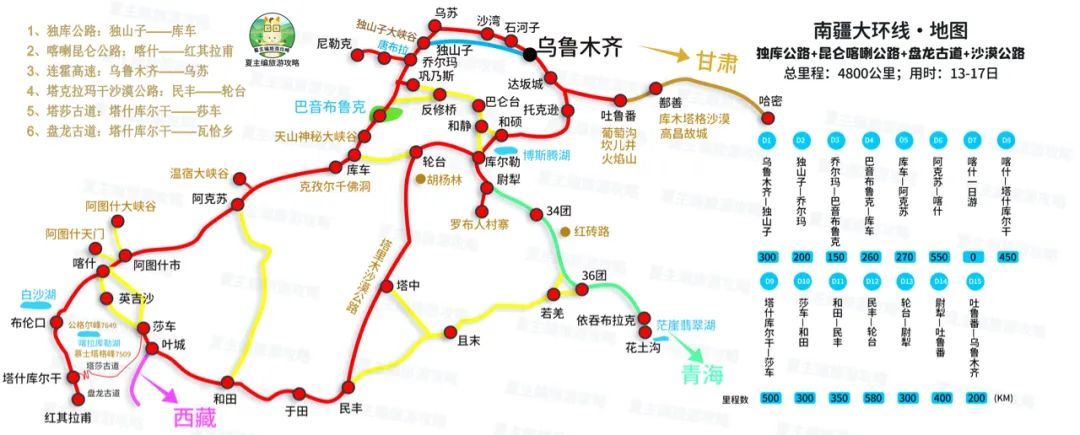 途经景观大道:塔克拉玛干沙漠公路、塔莎古道、喀喇昆仑公路、盘龙古道。