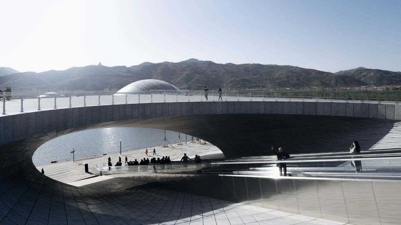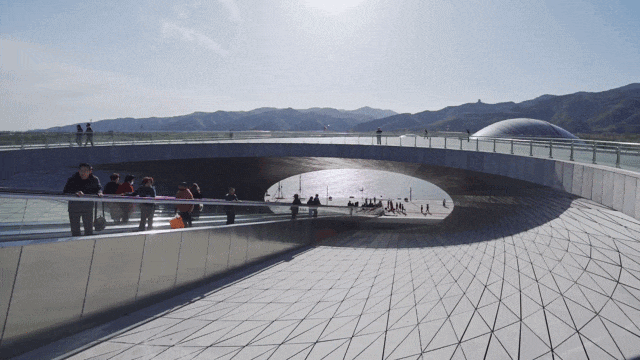 来到悬挑的观景台后回望,远处的群山与湖泊在巨型建筑的遮挡下交错呈现,仿佛一部登陆外星的科幻大片。