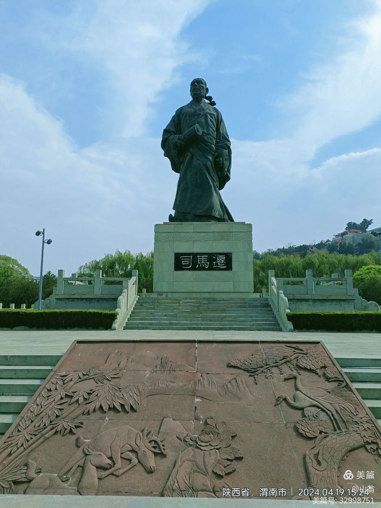 图片:耸立在韩城市芝川镇司的马迁祠景区祭拜大道尽头的司马迁铜像。高12米〔寓12本纪〕,重26吨计52万两〔寓《史记》52万字〕