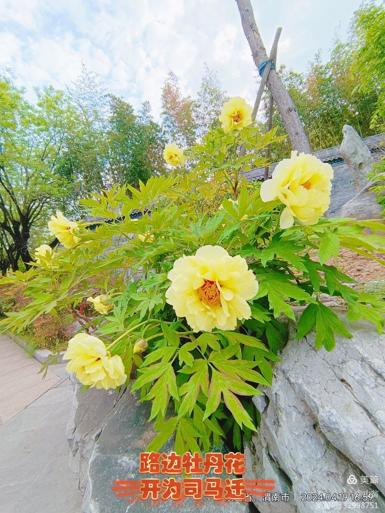 图片:太史公祠墓台阶旁边盛开的芬芳馥郁的牡丹花