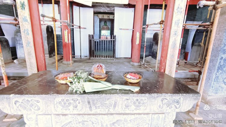 图片:司马迁祠正殿内的供桌,有人献上一束素白野花和祭品