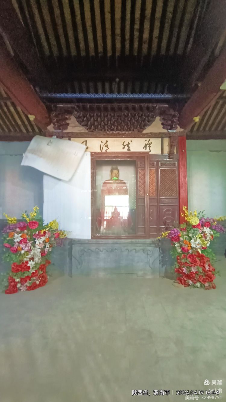 图片:司马迁祠正殿里司马迁像,因正在整修,整个殿堂架了许多钢管支架,显得零乱,但仍不失神圣