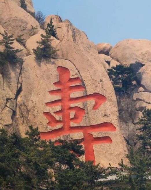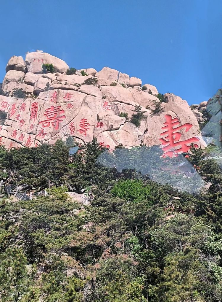 然后看到的是寿字峰,在巨大的峭壁上刻着很多寿字,构成了一幅壮观的百寿图。这些寿字都是我国古今近百名书法大师用不同的字体所写。