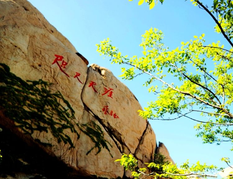 出了觅天洞,便可登上顶峰,路上有多处名家题刻,顶峰的峭壁上刻着“咫尺天涯”四个大字。