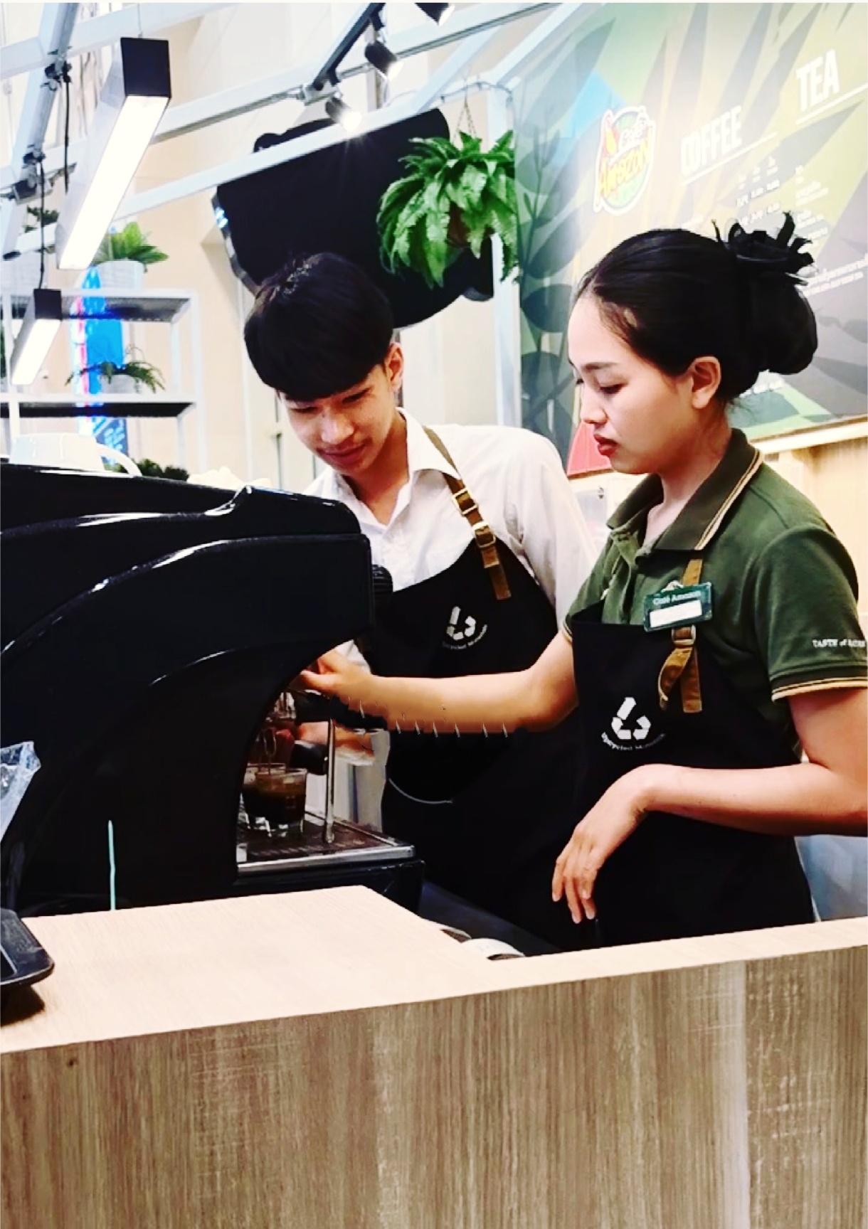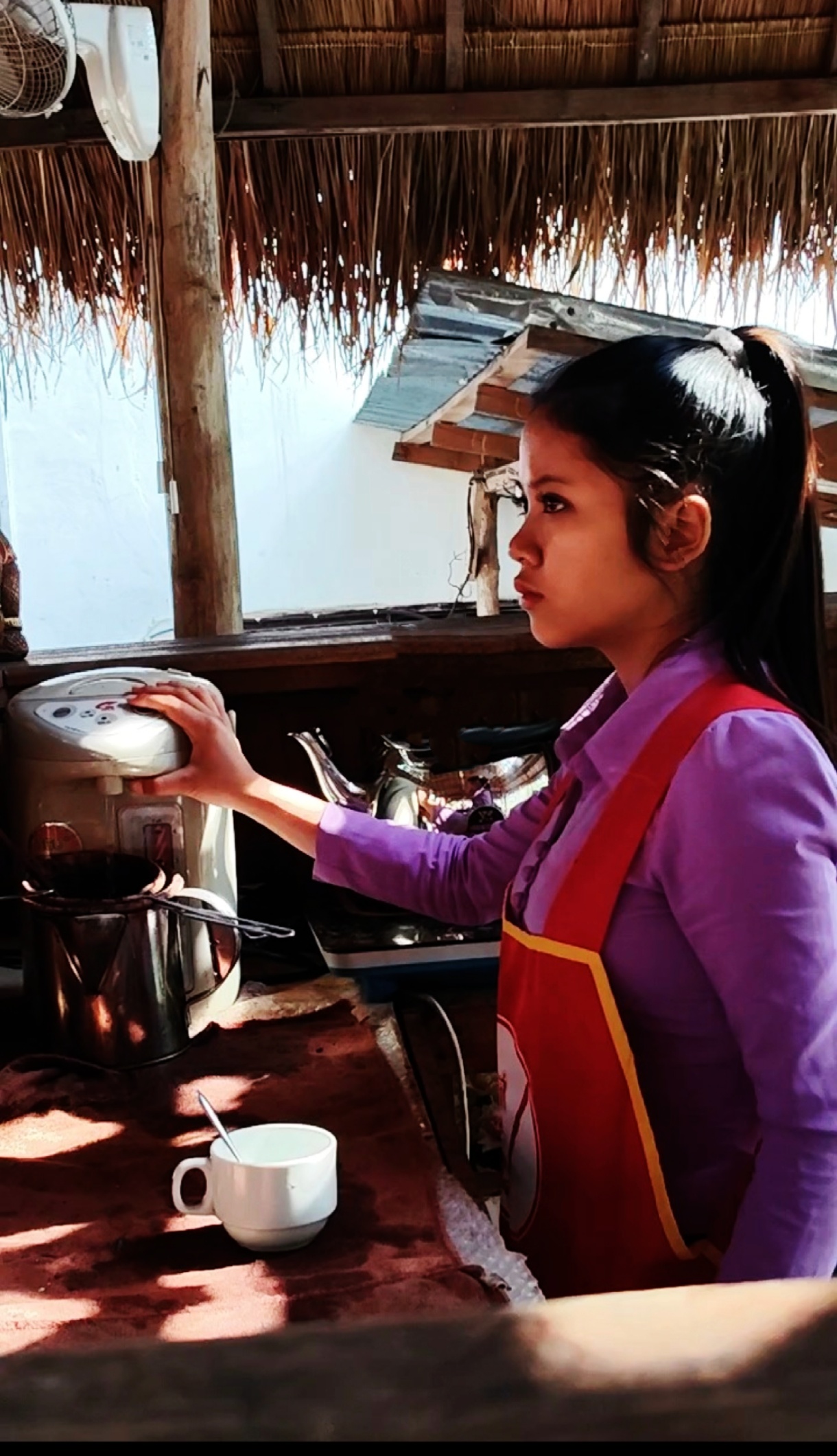 说到品咖啡还有一段小插曲。庄园里是现磨的咖啡,制作咖啡的是一位小姑娘,约十五六岁的样子,大大的眼晴扎着马尾辫,嘎嘎的漂亮。她用老挝传统的方式制作,一把壶带一个过滤漏网,把咖啡粉倒入其中,再注入沸水搅拌、提拉几次,咖啡液透过滤网慢慢流入壶中,一壶醇香浓郁的咖啡就制成了。小姑娘再倒入精致的咖啡怀中然后加一勺糖,端到客人面前。轮到我时,我告之不加糖,这引起小姑娘的不满,白了我一眼,恰好就落入了我的镜头里。呵呵,小姑娘生气也蛮漂亮的。