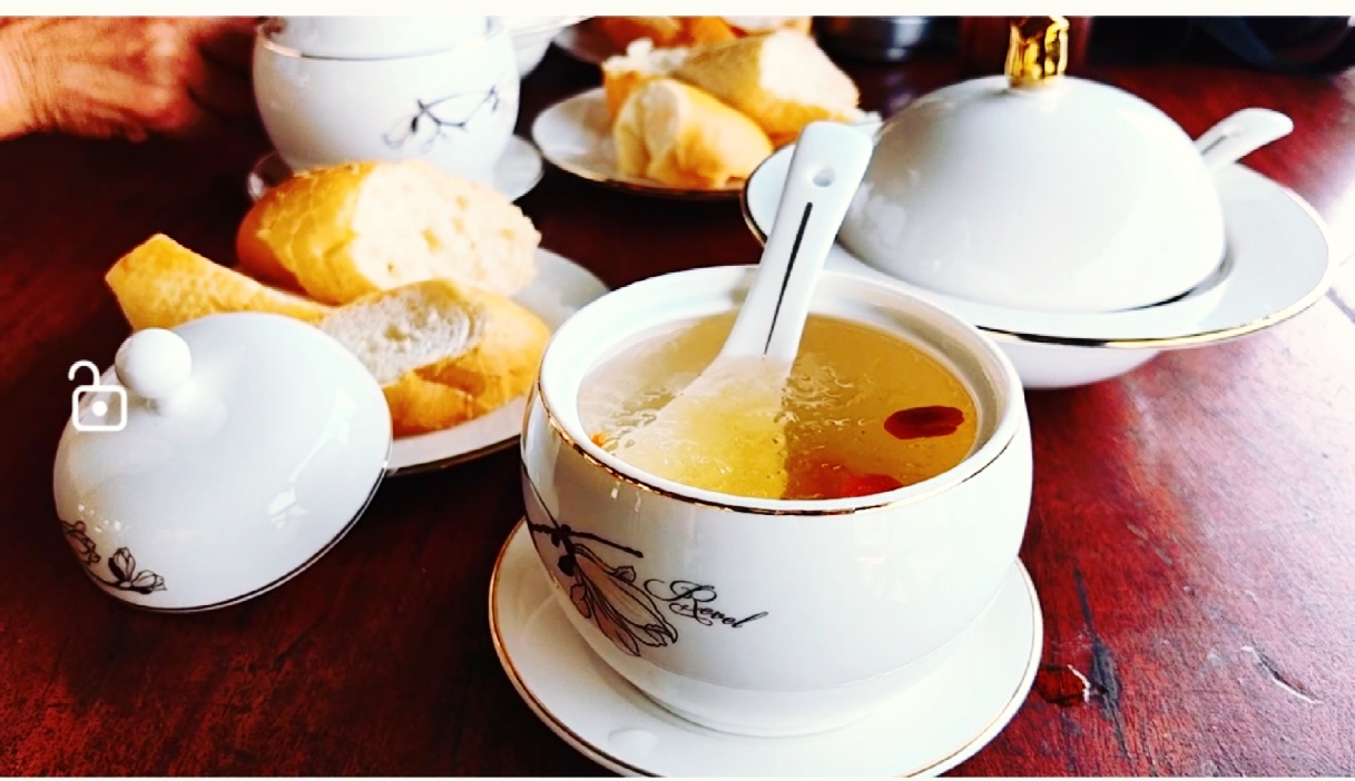 喝完咖啡时至中午,我们去吃了顿老挝火锅宴。火锅较丰富,各种菇类上了桌,大家大块朵颐,不亦乐乎。吃完饭,导游带我们去湄公河岸边看景。这是一家酒店的看台,紧临江边,此时,天气不是一般的炎热,但坐在带篷的看台里,吹着江风,看小船悠悠好不惬意。一会功夫,酒店给我们端上精致的茶品,打开盖是一碗燕窝粥,一碗菌类汤,这让我们很是意外,导游说这是旅游公司赠过的,你们只管享用。呵呵,我想旅游公司那根神经搭错了吧,从没见有对游客这么好的。