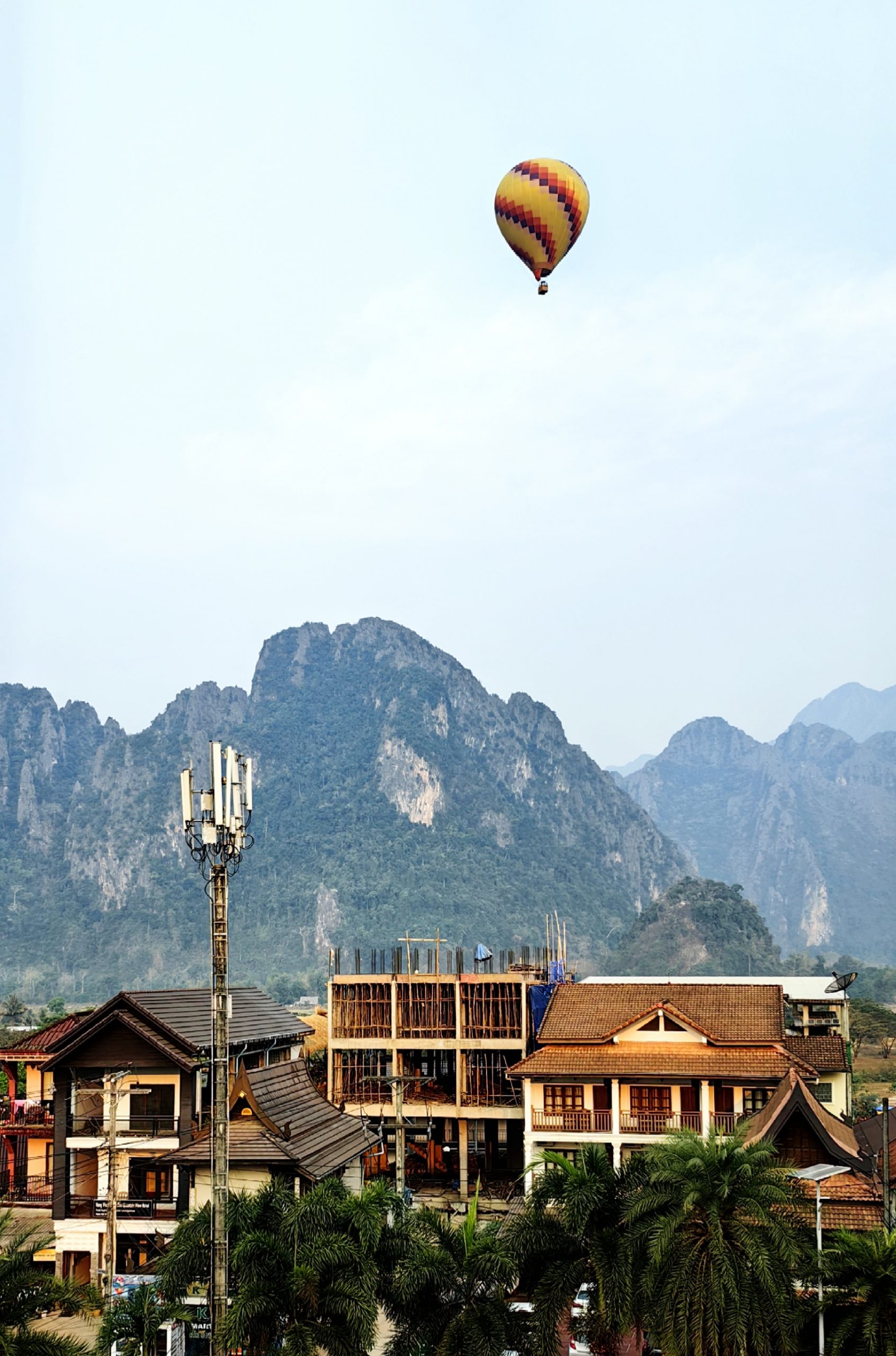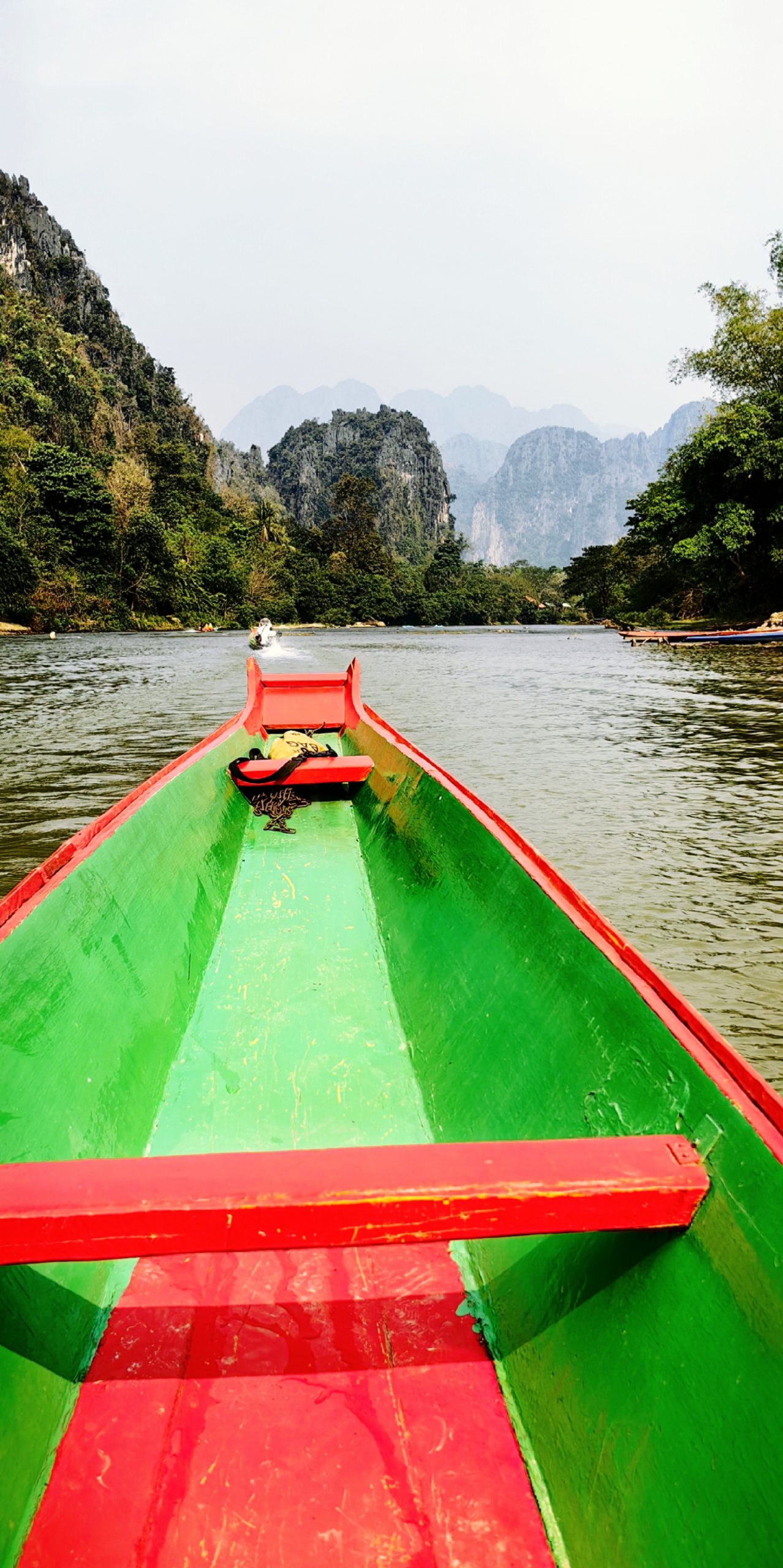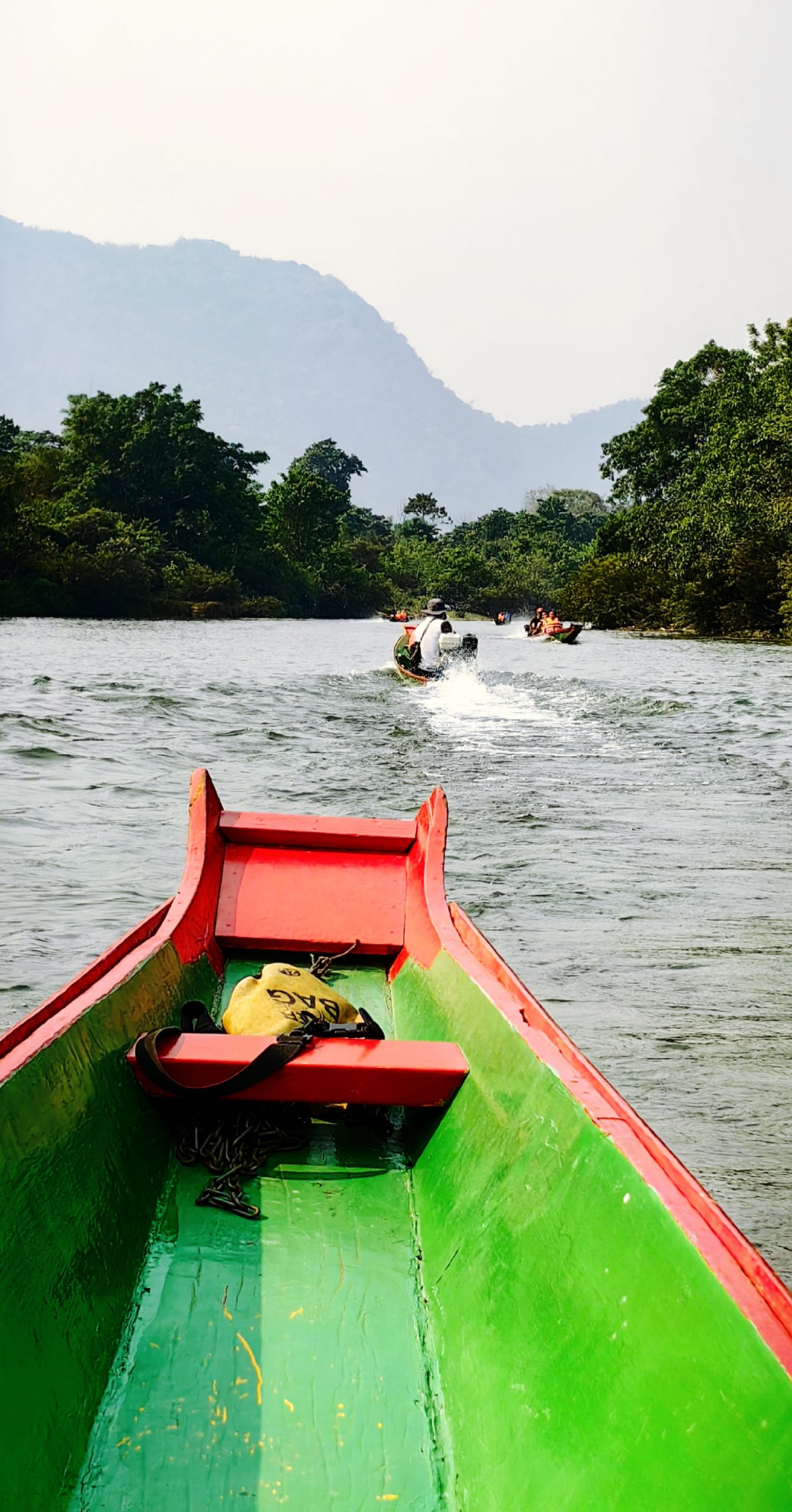 第二天早起,拉开窗帘一幅美丽的画卷扑面而来。窗外,峭壁耸立、峰峦叠翠的喀斯特山峰,飘荡着热气球,在雾蒙蒙的天空像天女散花一样美极了。站在窗前久久凝望,怪不得老外驱之若鹜前来万荣,原来这是绝美之地呀。清晨的万荣给了我新的视角感受,新的一天就从热气球开始了。早餐毕,我们很拉风的乘嘟嘟车去南松河。这条路是土路,坑坑凹凹,颠的人抓狂。看来要想富,先修路的理念也适合老挝。