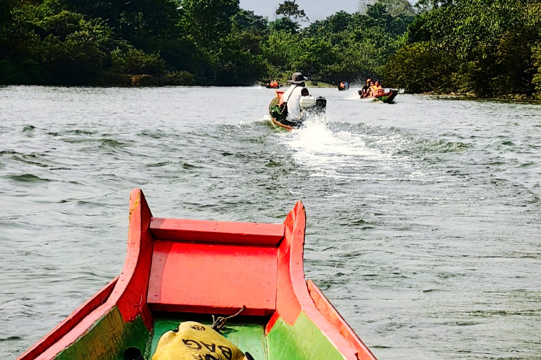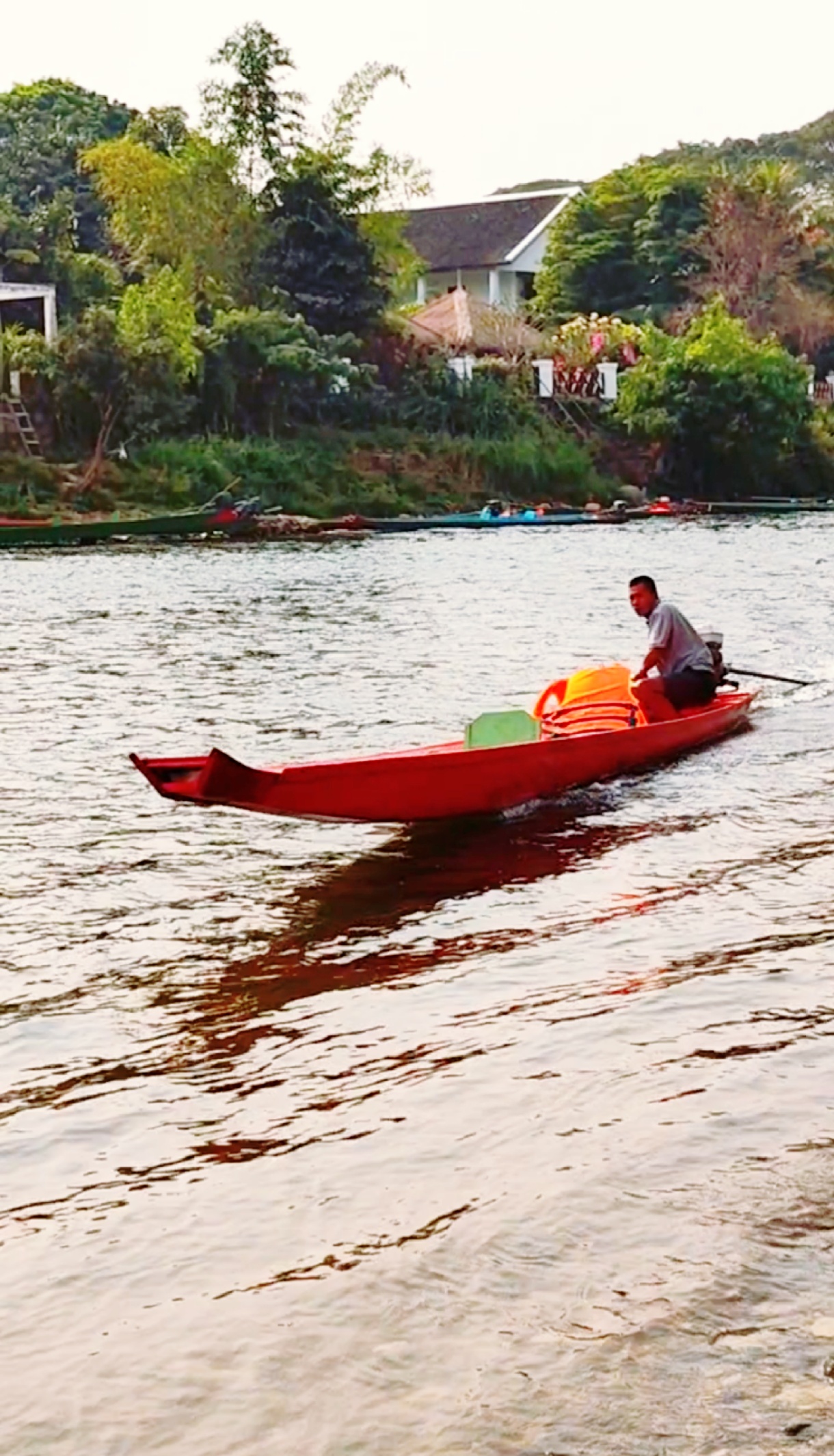 南松河是万荣的母亲河,下了车,导游把我们带到河边,两人一组坐长尾船漂流。我因是一个人参团,故一个人坐了一条船,真是豪横啊。这条长尾船窄窄细细的,两头尖,中间宽,最多能坐两人。我没见中国有这种船。每个船上配一个艄公是老挝人。与国内不同的是,艄公坐在船尾,开足马达,乘风斩浪,飞驰向前。我坐在船上,看两岸秀丽的群山,看清澈的河水,感受着冲浪的惊险和刺激。