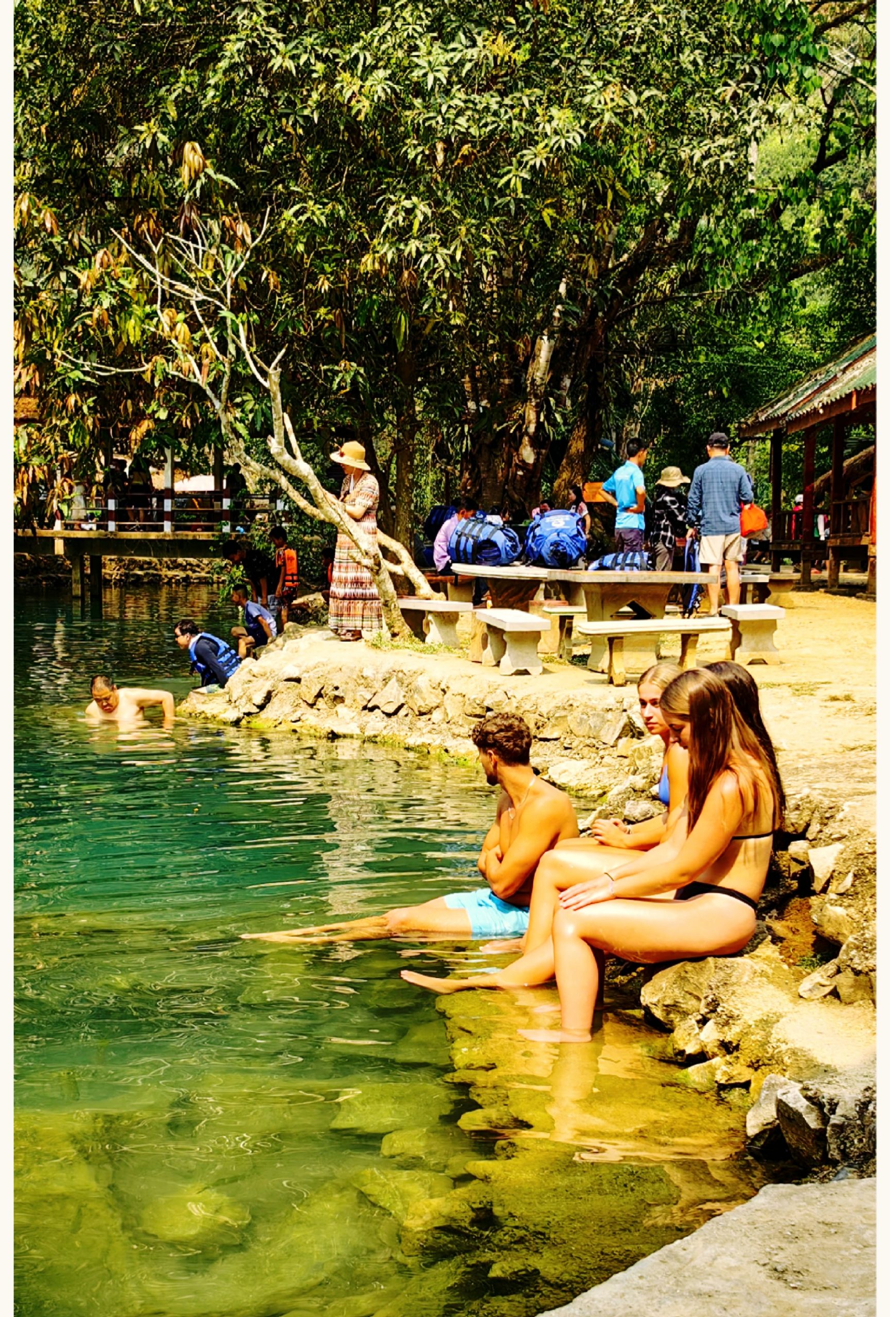 泻湖的水为什么这么清澈透明,泛着幽幽蓝光呢?看了介绍才知道,泻湖的水缘自山上的坦普坎溶洞,这是老挝人心目中神圣的地方。我们本来是要去溶洞参观的,可是因天气十分炎热,大家都不想爬山了,故放弃了这处景点。溶洞里的水富含矿物质,因此呈现出美丽的碧蓝色,这就是泻湖的蓝色之缘。总的来说,万荣以其独特的自然风光和人文景观吸引了大量游客前来观赏和休验,沿途能看到许多欧美人背着巨大的登山包,在这里他们找到融入自然的快乐及放松身心的美丽。(2024.5.15日)待续