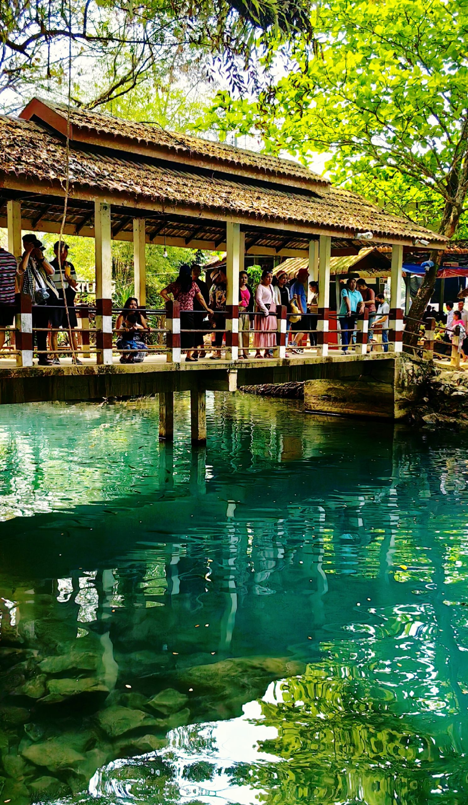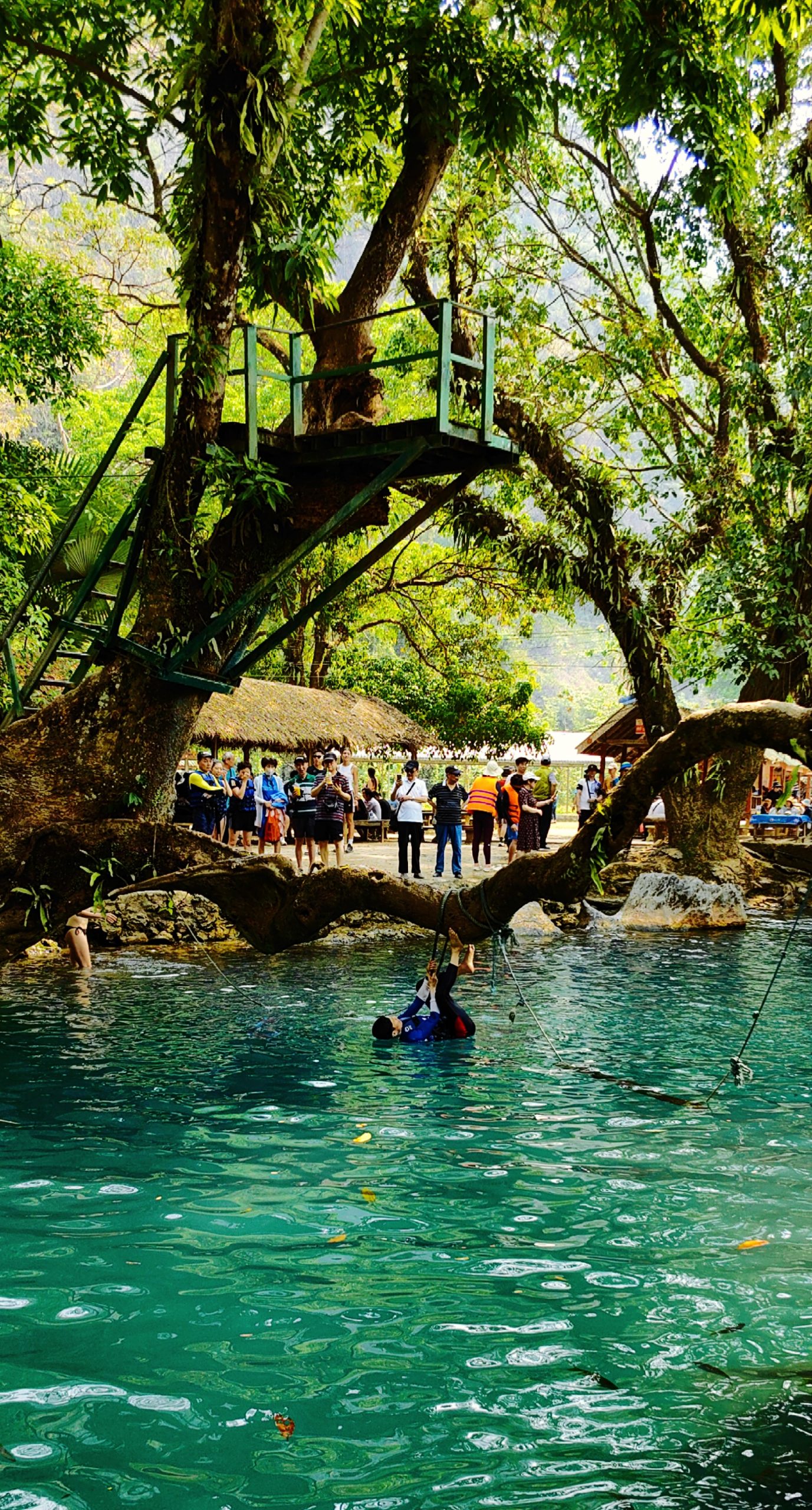 在万荣还有一处绝美之地——蓝色泻湖。蓝色泻湖,听名字就令人神往。在体验完南松河的漂流后,我们前往泻湖打卡。走进景区,映入眼帘的泻湖实在是耀眼,大大的惊艳了我。只见:一池碧水蓝幽幽,鱼儿摇弋水中游。青山树影落池中,游客嬉水乐悠悠。我沿着湖边转了一圈,泻湖实在是小,属于袖珍式湖泊,但唯美精致让人赞叹。湖边有一棵百年老榕树,形成了天然的跳台,有人爬树跳水。游客坐在遮阳棚里,赏湖光山色,看跳水撒欢,享受放松和惬意,悠哉,乐哉。