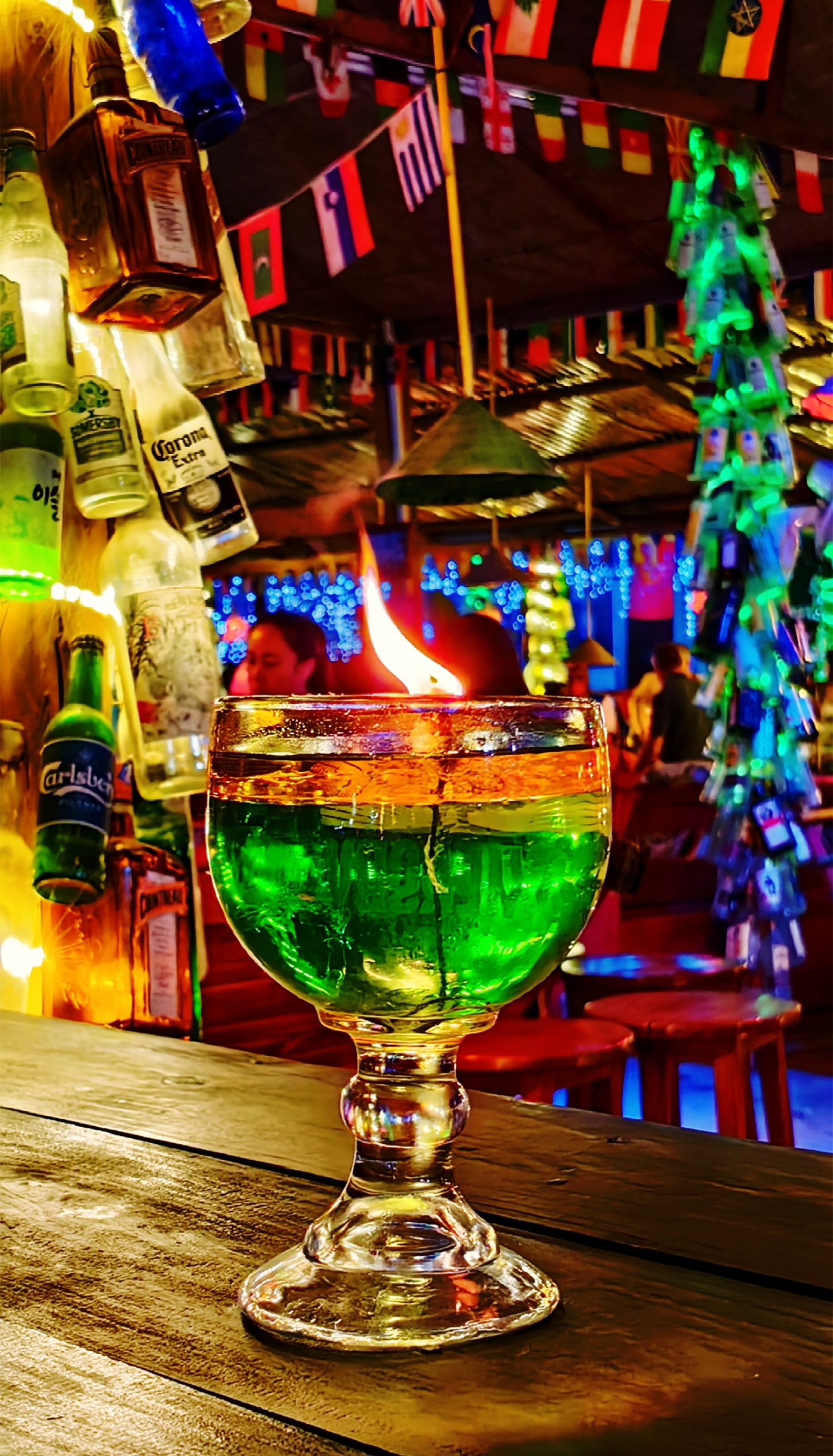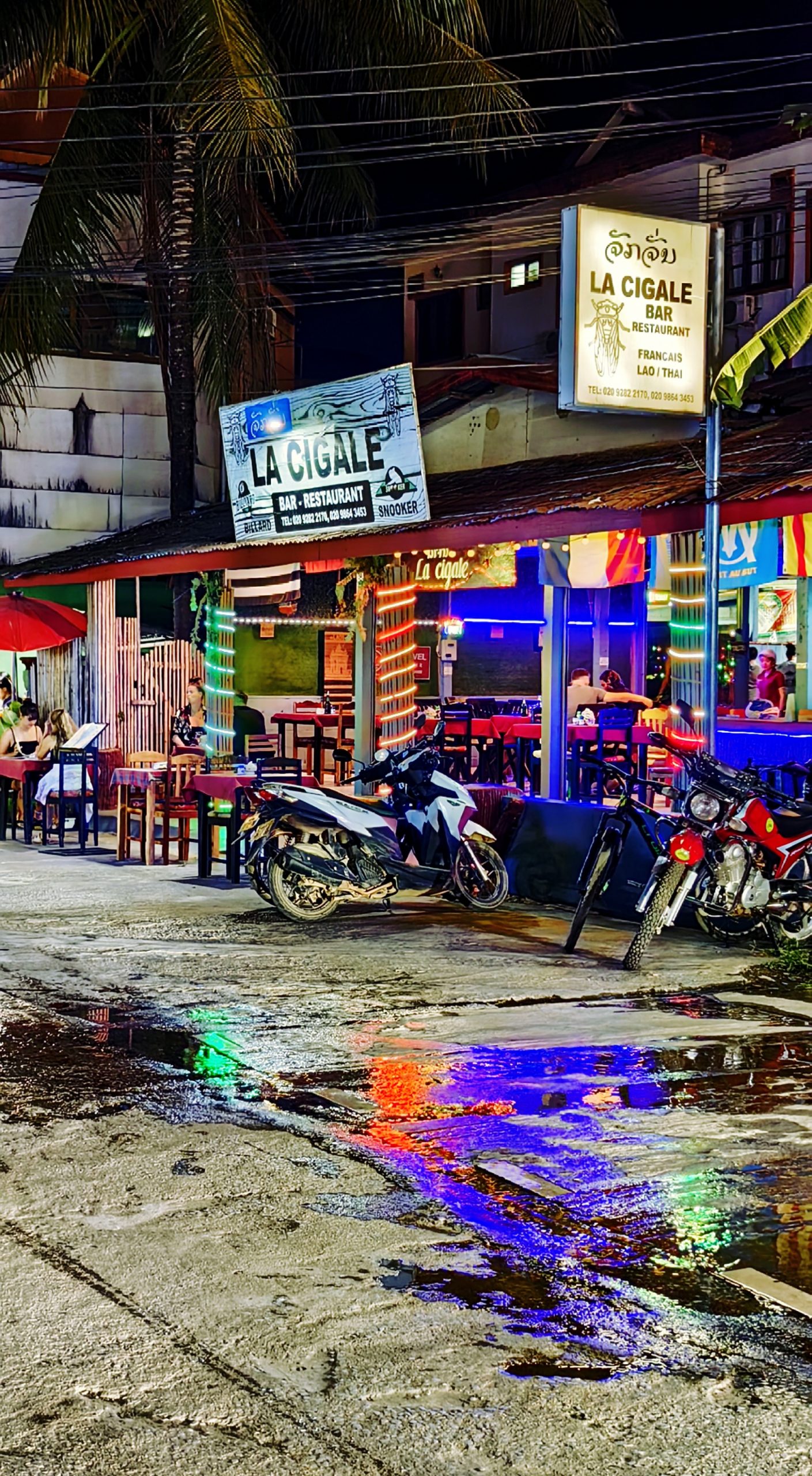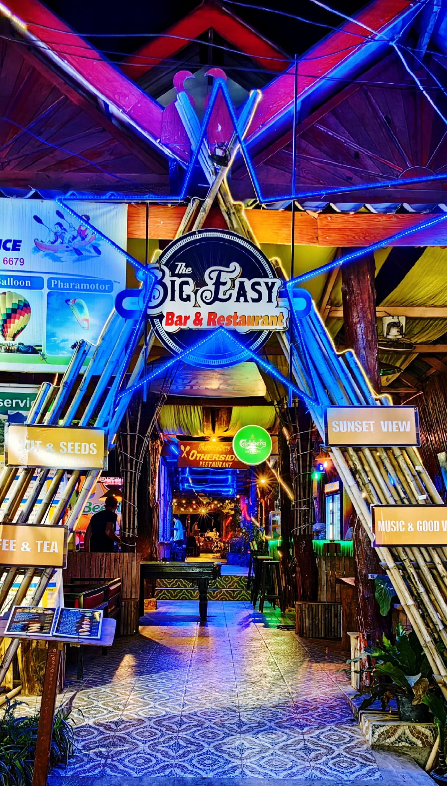 走进酒吧街,除了迷人的灯光外,到处都是静悄悄,酒吧里没有剌耳的音乐,只有轻柔舒缓的曲子。酒吧里人不是很多,可能夜生活还没开始吧?我看见大厅的矮方桌周围放的不是椅子,而是用垫子铺满地板,有人躺在垫子上呼呼大睡。吧台的高脚椅上坐着几位欧洲姑娘,她们面前各自放着一瓶啤酒,慢慢的呷,轻声细语,桌上的灯忽闪着,时间仿佛静止了。这里各种风格的酒吧让人眼花缭乱,虽说老挝贫穷落后,但夜生活却丰富多彩,尤其酒吧街极其奢华。