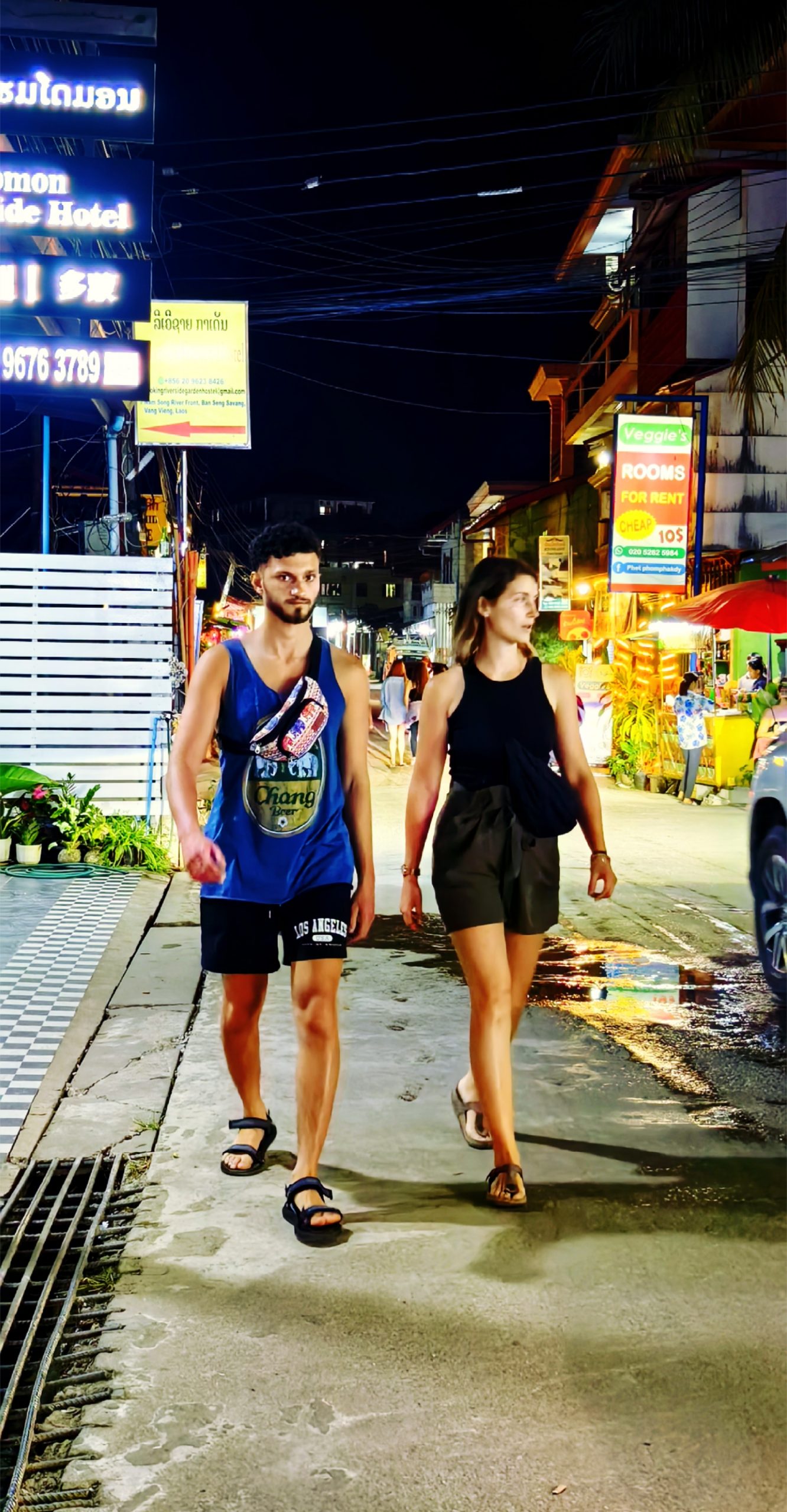 傍晚乘火车前往万荣,一个小时既到达。接站的汽车缓缓驶进万荣酒吧街区,这是我们的下榻地。道旁法式小楼里闪烁着迷人的灯光。酒店还是一如继往的好,干净宽敞,住着舒心。导游告之,万荣酒吧街很出名你们可以去看看。放下行李,我去街上逛了一圈。万荣不大,充其量算得上是一个小镇。但这个小镇可不一般,她有喀斯特地貌,像中国的小桂林。各国背包客长期留恋于此,被称为户外爱好者的天堂。