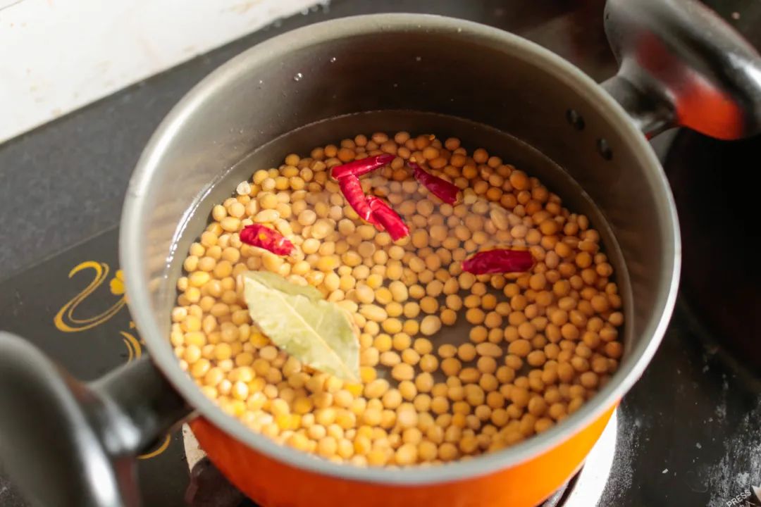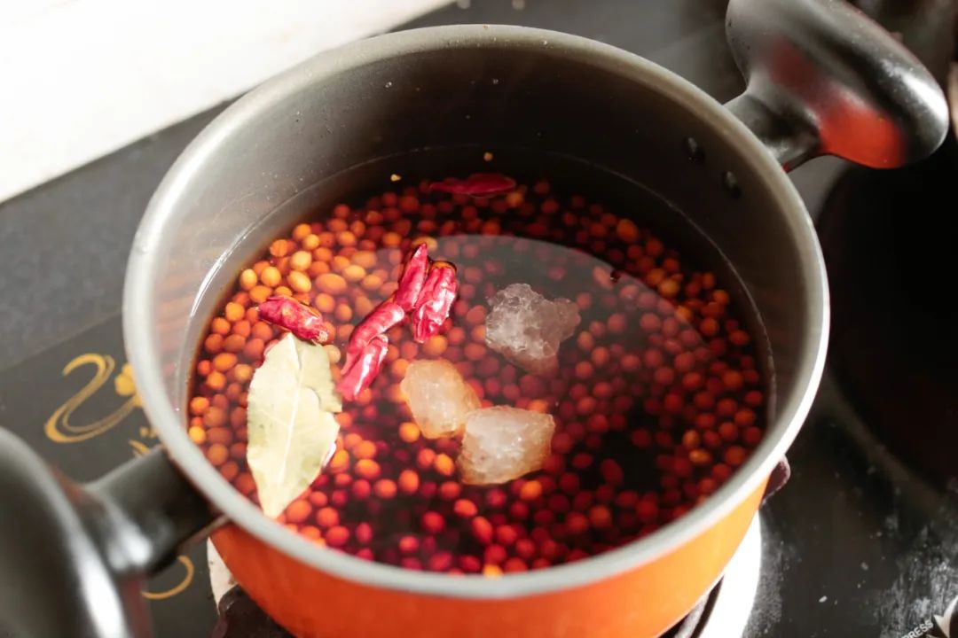 2. 浸泡好的黄豆清洗两遍放入锅中,加足量的水,干辣椒和香叶冲洗后,揉搓后一同放入。