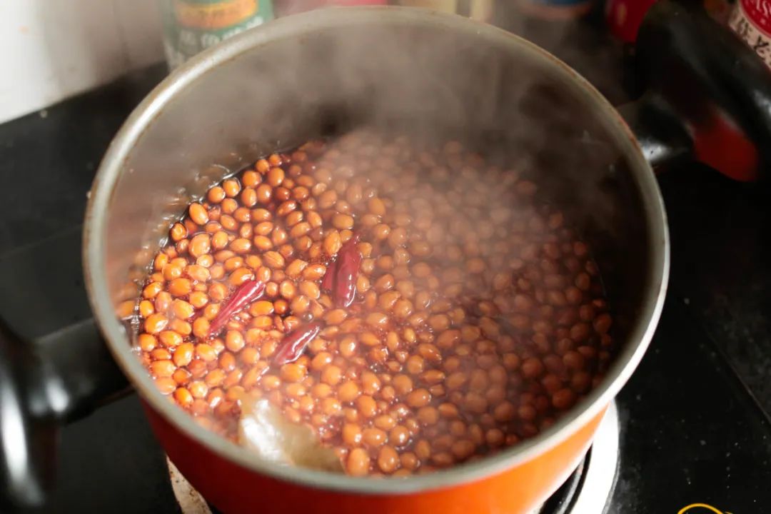 3. 加3块冰糖、3瓷勺生抽、1瓷勺老抽,水开后转小火,然后一直煮到豆子变酥软,关火焖一下。