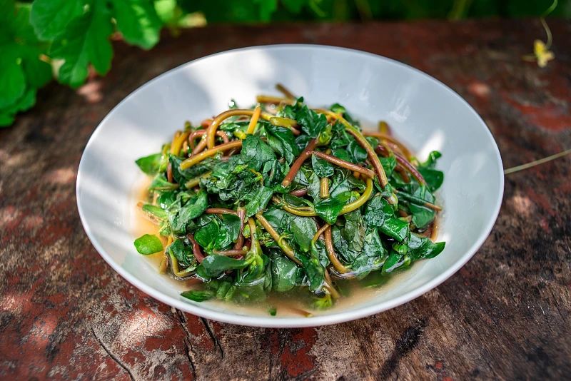 马齿苋的水分含量高达90%以上,所以吃起来多汁爽口。和其他野菜不同的是,马齿苋本身没有苦味或者涩味,微微有一些咸味和酸味,所以福建等地区会把马齿苋叫做“酸菜”。