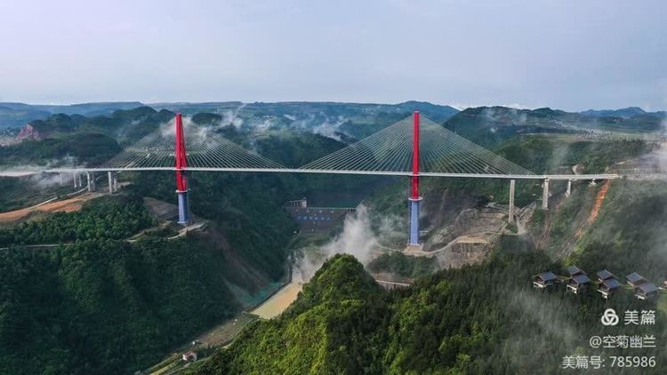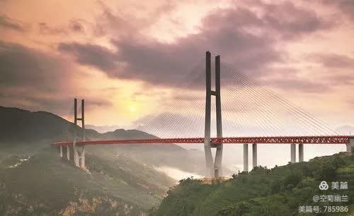 崇山峻岭如绿色的城堡,一条红色巨龙般的斜拉桥横亘其间,灰色的桥墩如巨型的龙爪嵌入大地,一道道斜拉索犹如硕大无朋的翅膀,穿透了山间的云雾,遮蔽了周围的天空。