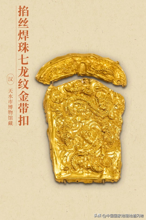 汉·掐丝焊珠七龙纹金带扣。 摄影/柳叶氘 制图/九阳