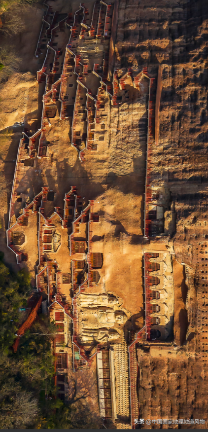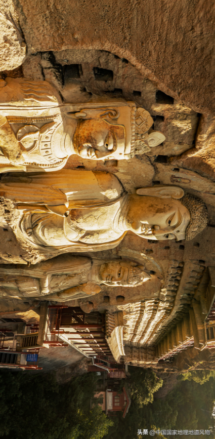 在百余米的悬崖峭壁之上,当年的巧匠修建出整整14层栈道,上下连接了密如蜂房的洞窟。行走于其中,仿佛是在探索一座“超级玛丽”的跳板迷宫,这实在是超前于时代的建筑技术奇迹。麦积山石窟群中最宏伟,最壮丽的“散花楼”(七佛阁),正是中国最大的一座摹仿中式传统建筑的洞窟,南北朝文学大家庾信在此窟完工时作序赞曰——