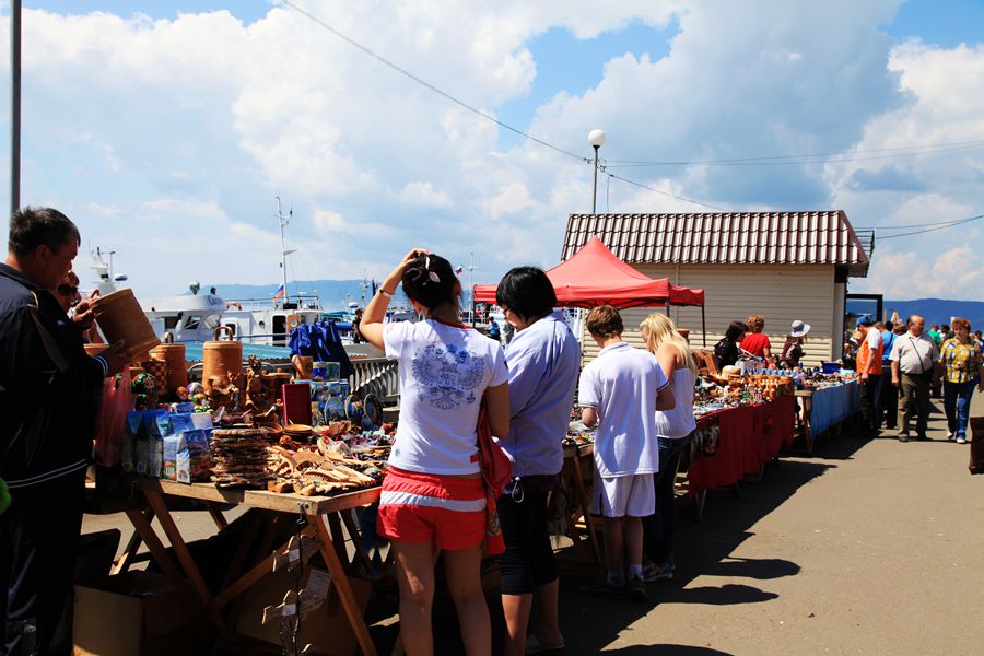 船开到湖中心打道回程,一圈下来用了2小时。下了船,和导游联系集合地点,我们就徜徉岸边的工艺品街和渔市。贝加尔湖岸边和中国一样,商业气氛浓郁,商铺比比皆是,有土特产品店、珠宝首饰店、美味小吃店、烤鱼店、服饰鞋包店等,琳琅满目的商品令人眼花缭乱。