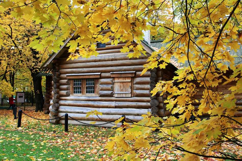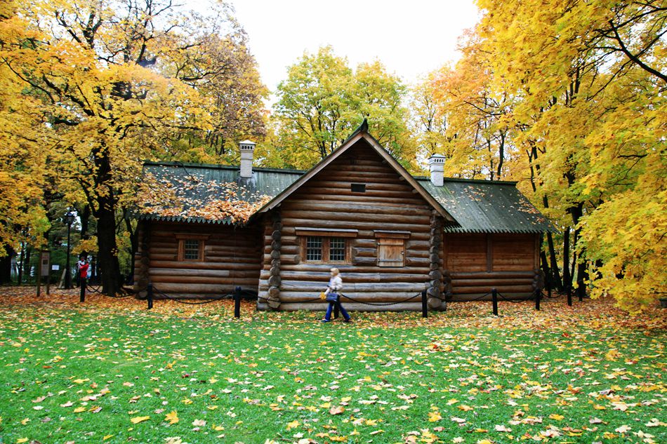 踩着厚厚的落叶走进密林深处,看见了彼得小木屋,屋前塑有彼得大帝的雕像。这座小木屋用去了皮的圆木搭建,孤零零的座落在树林中,被参天大树包裹着,地上落满了金色的叶子。这座小木屋很象童话世界里的小房子。我们听导游讲过彼得大帝悲惨的童年,这间小木屋是他童年生活的地方。
