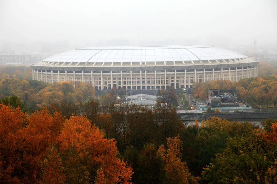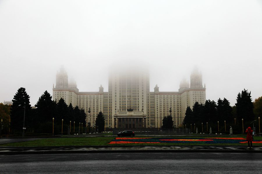 餐毕出来,天空下起小雨。导游说莫斯科的天气是男人的心女人的脸说变就变。我们冒雨去麻雀山参观莫斯科大学。十月中旬的莫斯科雨天是很冷的,风象小刀吹在脸上硬生生的疼。麻雀山观景台是莫斯科市的至高点,最高处海拔220米。听说这个观景台很有名气,站在上面能够俯瞰莫斯科市容。可惜云山雾罩,观景台上什么都看不到,只有卢日尼基体育场在云雾里若隐若现。