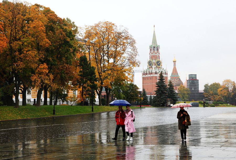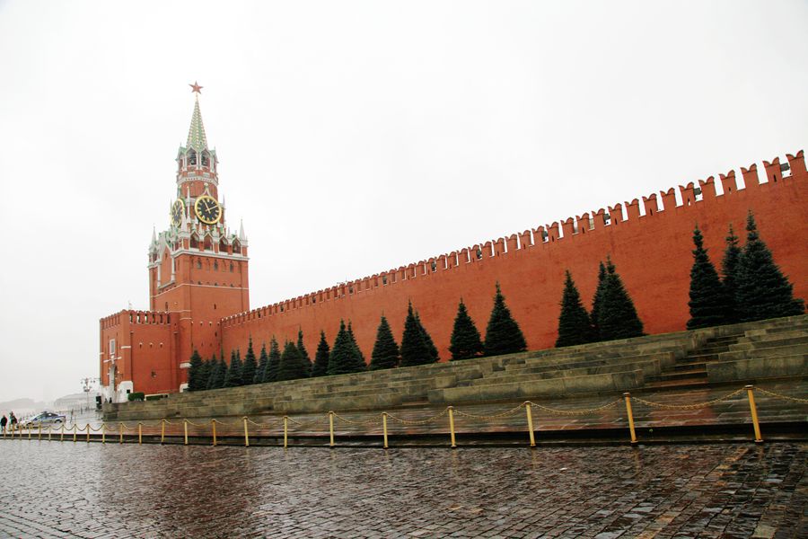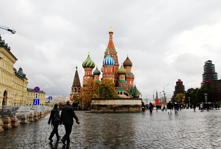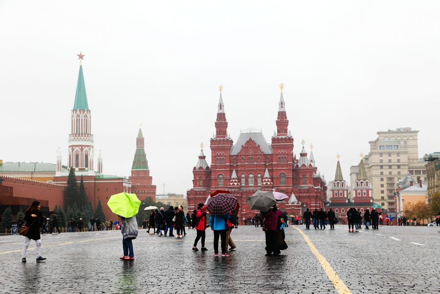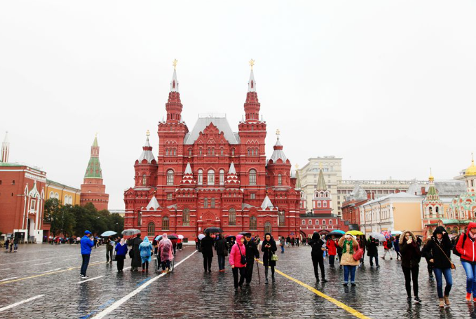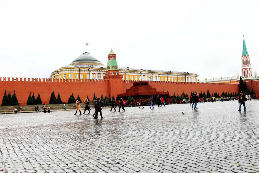 第二天,莫斯科又下雨,我们真是运气不佳,因为今天要参观克里姆林宫和红场。走进期待已久的红场,雨下的更急了,噼噼啪啪的雨声象鼓点。导游规定了集合时间,解散队伍,让我们自由观赏。站在雨中,我望着这个被世界瞩目的红场,心情很激动。同时又感觉红场和电视上看见的有些差别。我以前看过俄罗斯大阅兵,飞机、坦克、大炮、装甲车轰隆隆驶过红场,一队队的仪仗队跨着大步,甚是壮观。那时,我以为红场很大。可是,今天看到的红场却不甚大,听说只有天安门广场的五分之一。