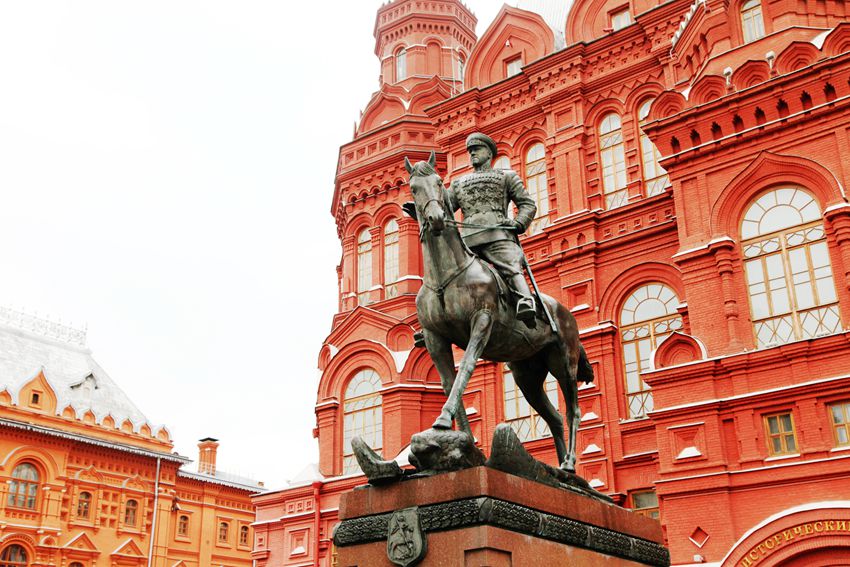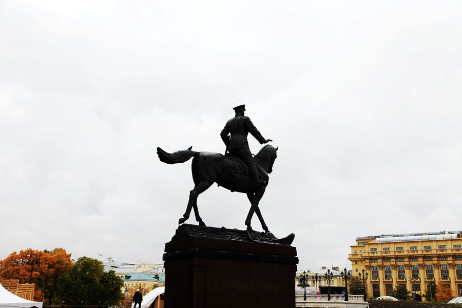 在红场我最想瞻仰列宁墓,可是这天列宁墓不对游人开放,我只能在墓前拍照留念了。红场四周还有国家百货商场,国家历史博物馆等建筑。其中用青铜打造的朱可夫元帅雕像就耸立在国家历史博物馆门前。朱可夫是俄罗斯赫赫有名的大功臣,四次荣膺俄罗斯英雄荣誉称号,深受俄罗斯人民的喜爱。他是俄罗斯胜利的象征。