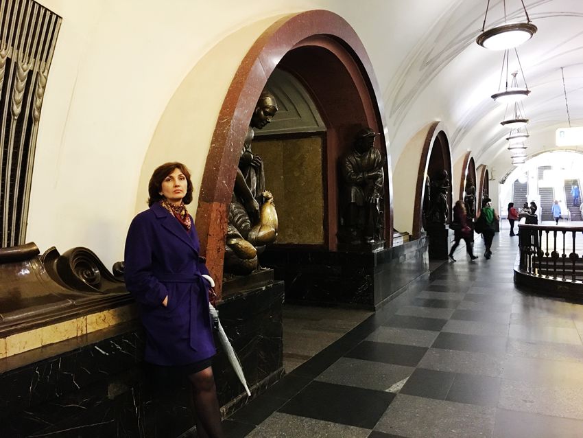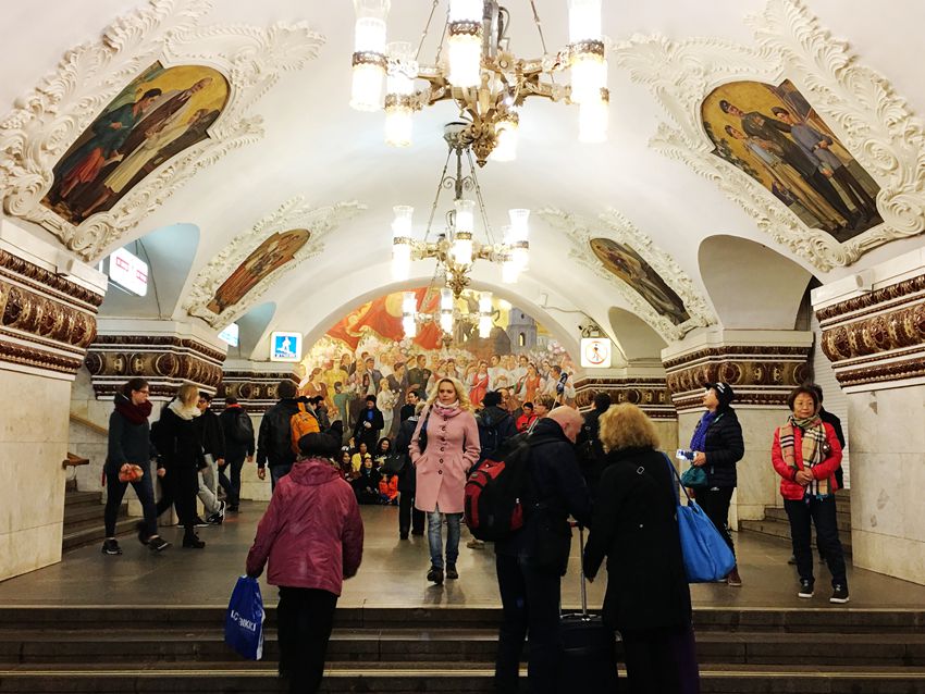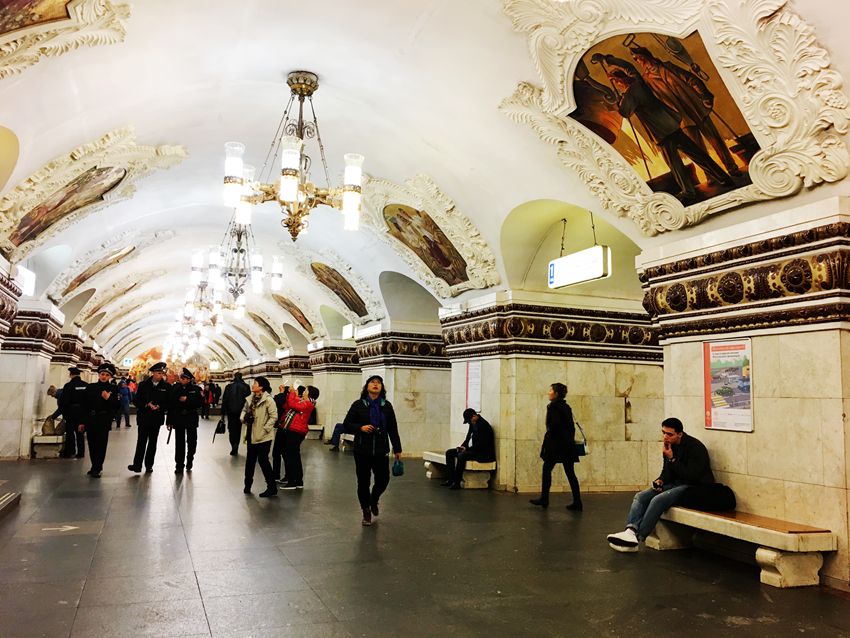 同样,莫斯科地铁也属自费项目,与新圣女公墓一个价,都是100大洋。看地铁大家都报了名,可却被导游黑了一把。导游没带我们去看该看的地铁站,而是领我们到最近的最普遍的地铁站。导游欺负我们不懂,其实,100大洋买票的地铁站叫《马雅可夫斯基》站,拥有莫斯科地下宫殿的美誉。是莫斯科最重要的观光景点之一。旅行之前,我做过攻略,资料介绍,这段地铁如同宫殿般金碧辉煌,内部装饰富丽堂皇闻名世界。导游领我们看的地铁站是莫斯科最普通的地铁站,是免费的。