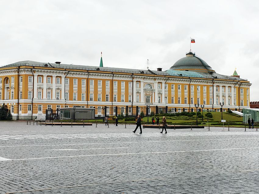 克里姆林宫大宫殿是一幢淡黄色的建筑,气势庞大,雄伟无比。整个楼为正方形,听说内部拥有700个房间,占地将近20万平方公尺。总统普京就在此办公,是全俄罗斯最高权力的中心所在地。除了上面看见的楼层,听说地下还有几层。离大楼不远,有一处小形停机坪,听说普京每天都开飞机上下班,这是他的专用机场。大宫殿壁垒森严,充许游人远观,不得靠近。听说普京下令,优待中国游客。如果走路上被警察查到了,你又没带护照,如果一说中国人,立马不罚款了。