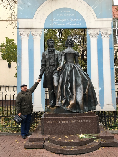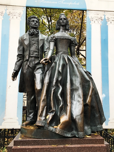 听说这条大街曾是莫斯科艺人和画家荟萃的天堂,也曾遭受侵略者铁蹄的践踏。这是一条有历史的大街。著名诗人普希金的故居就座落在这条街的53号。诗人生于此,12岁离开。最后再次回到这里,并于俄国第一美人娜塔丽娅结婚。这是诗人短暂一生中最灿烂美好的时光。故居矗立着一座青铜雕像,诗人身穿燕尾服,潇洒浪漫,妻子身着长裙,娇艳无比,两人携手并肩站立着。这对才子佳人本应过着美满幸福的生活,却因妻子酿成了悲剧,令人嘘唏不已。往来的游客纷纷在雕像前留影缅怀。