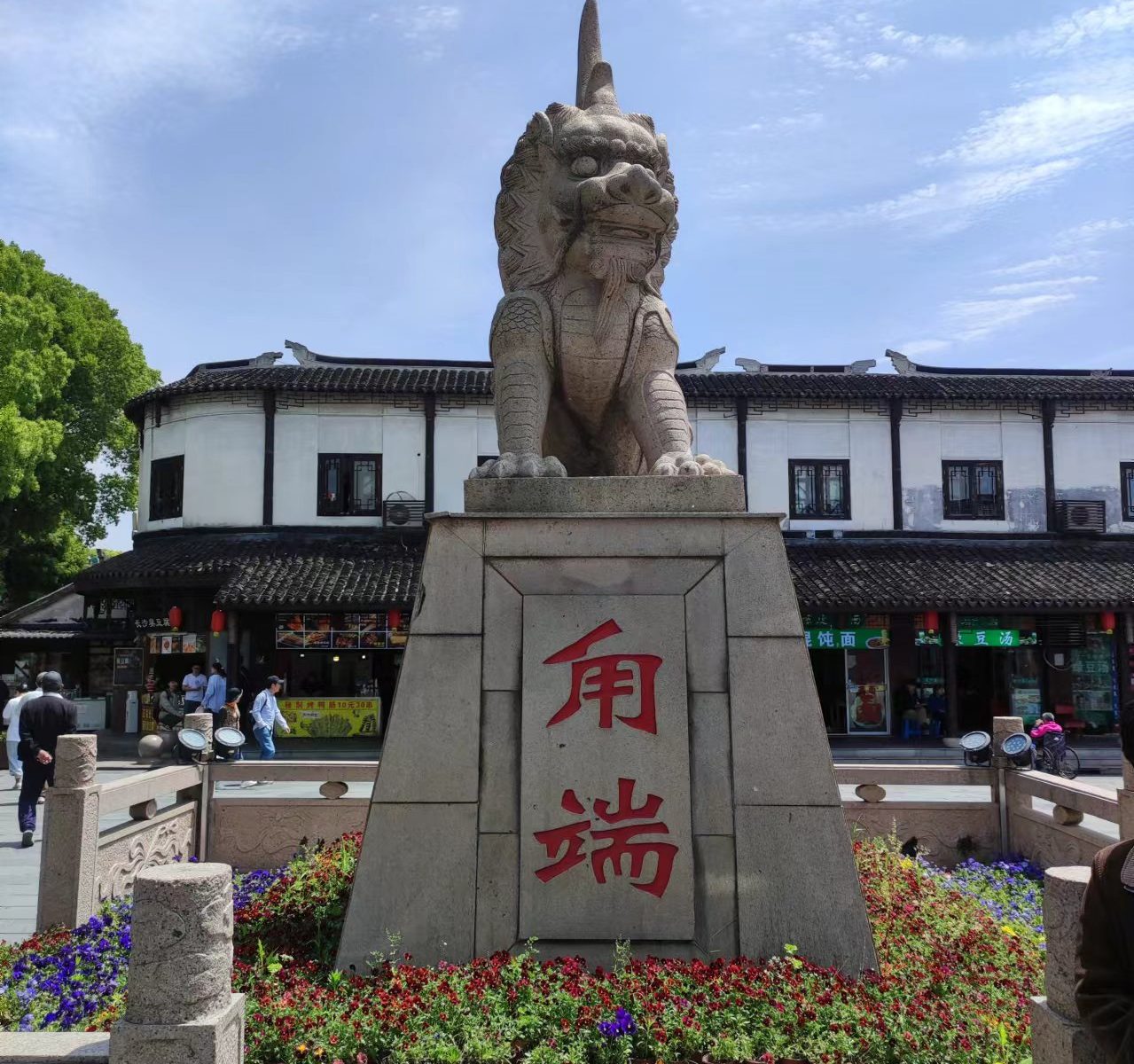 古镇的广场上用花岗岩雕刻成6米高只有一个角的动物——甪端,它奇形怪异,犀角、狮身、龙被、熊爪,鱼鳞、牛尾。据说这是一种神兽,在古代秦始皇时被命名为甪端,又传说在很早很早以前甪端日行一万八千里来到了苏州吴中浦里镇。从此,浦里镇一带风调雨顺,少有天灾,丰衣足食,安定祥和,后人把浦里镇改为甪直镇,午后的阳光洒在甪端上更显灵气和吉祥。