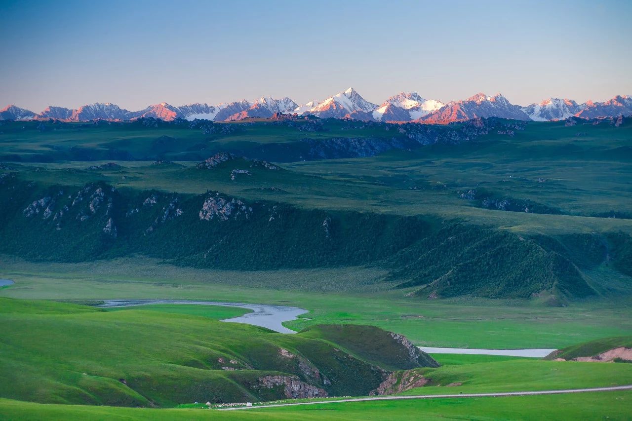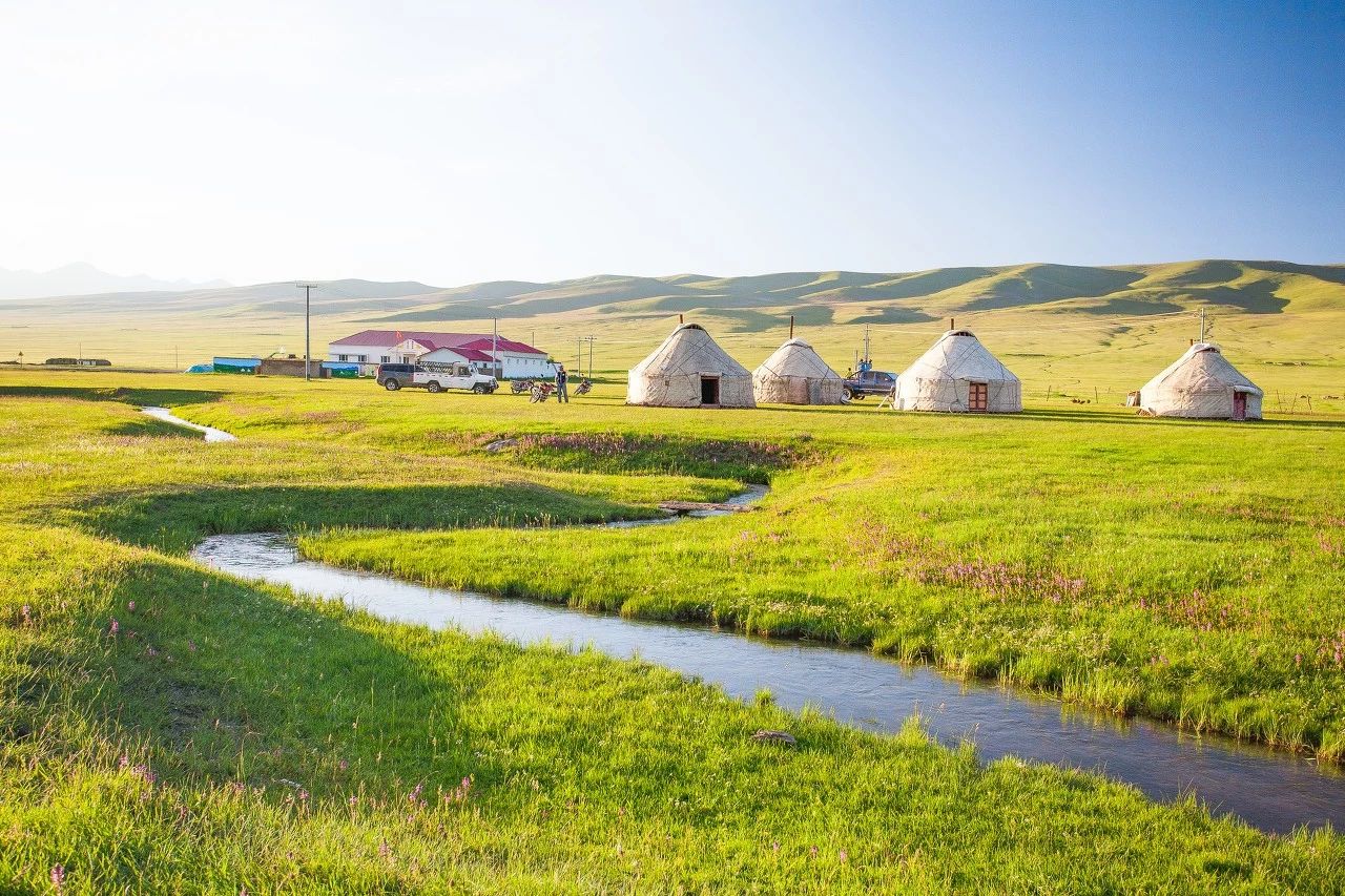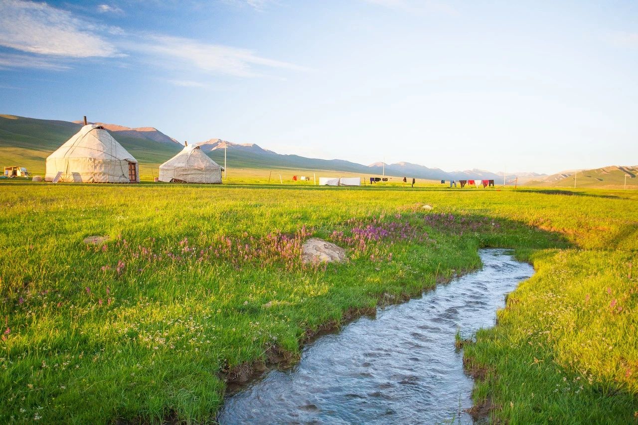 远处的雪山变成了粉色,帐房边的河流在初升的阳光下泛光,马儿悠闲地沐浴在和煦的晨光之中,草原上五颜六色的野花迎风招展着。