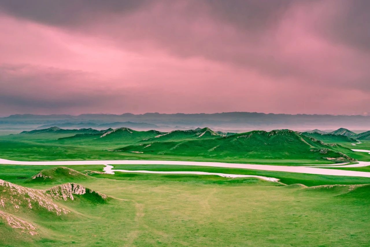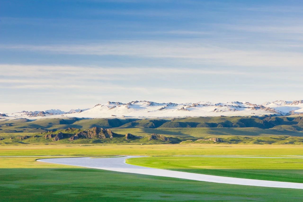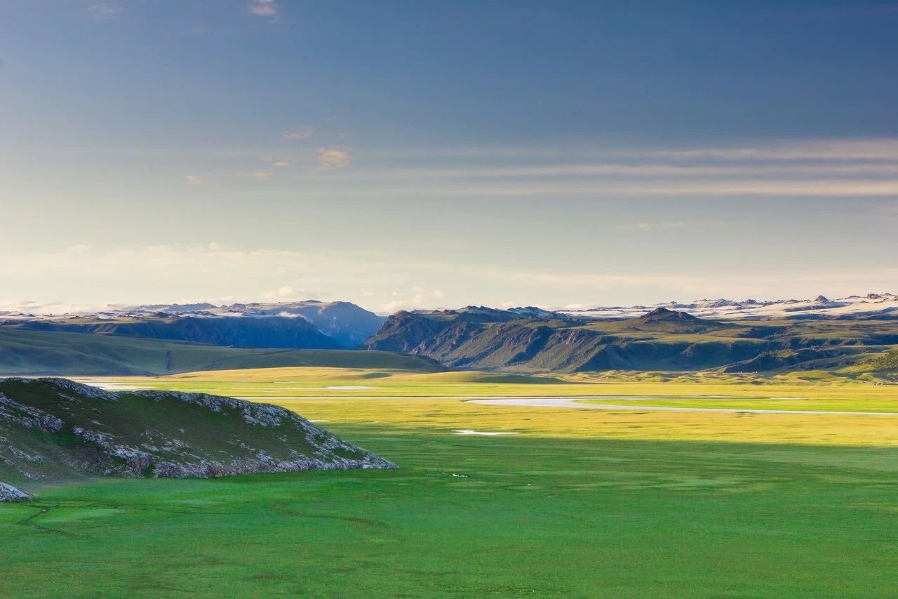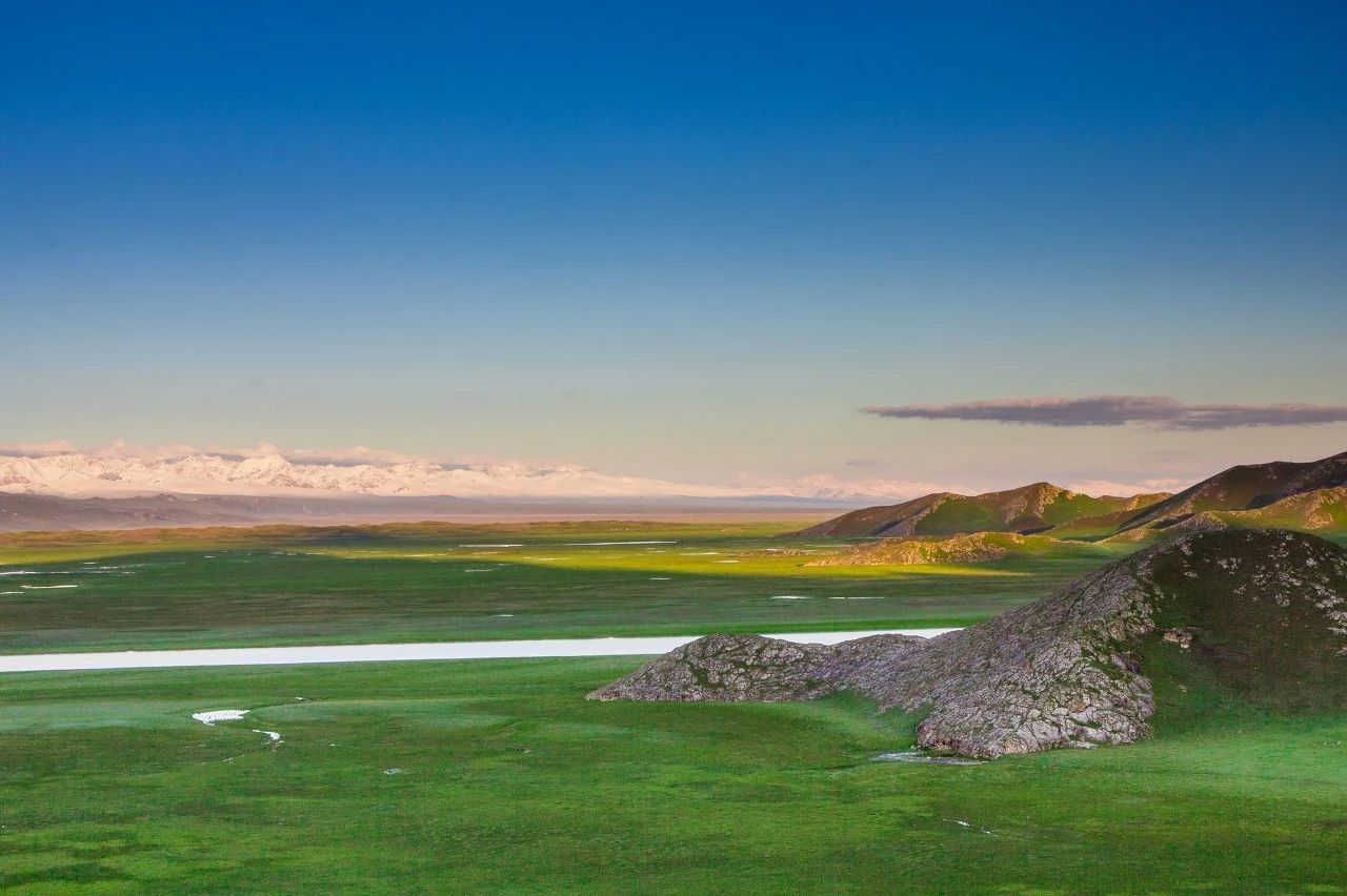 远处的雪山变成了粉色,帐房边的河流在初升的阳光下泛光,马儿悠闲地沐浴在和煦的晨光之中,草原上五颜六色的野花迎风招展着。