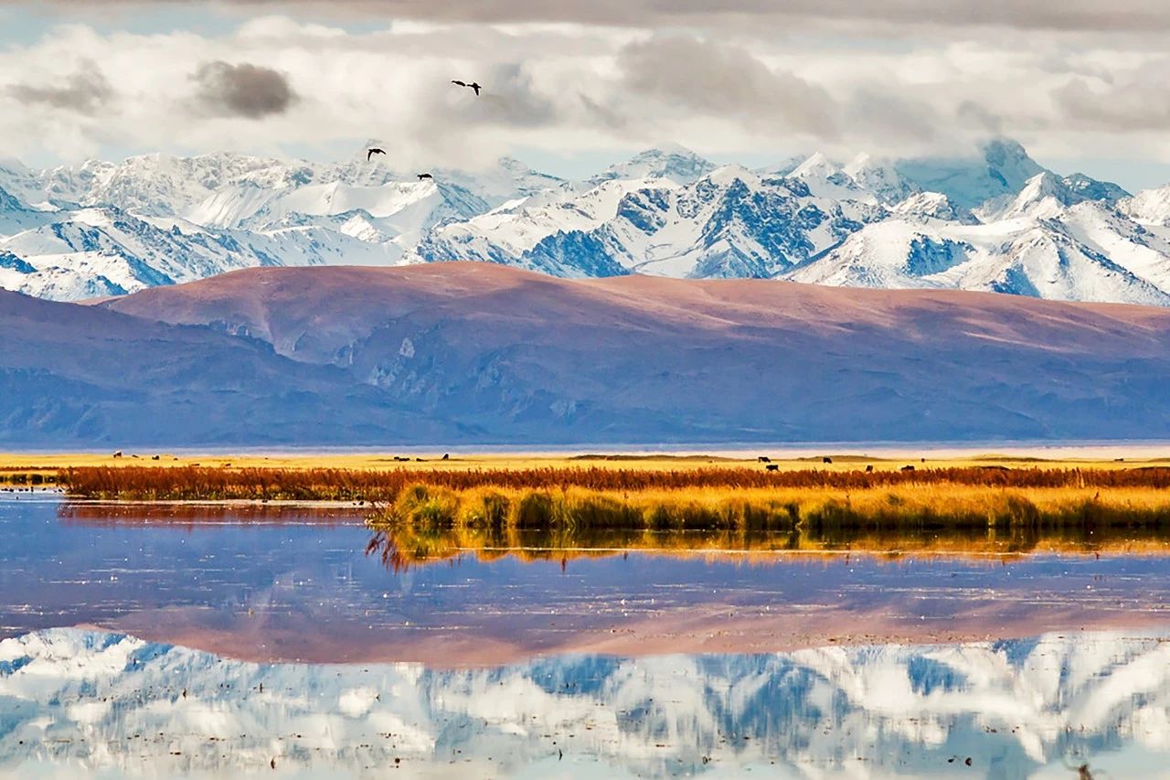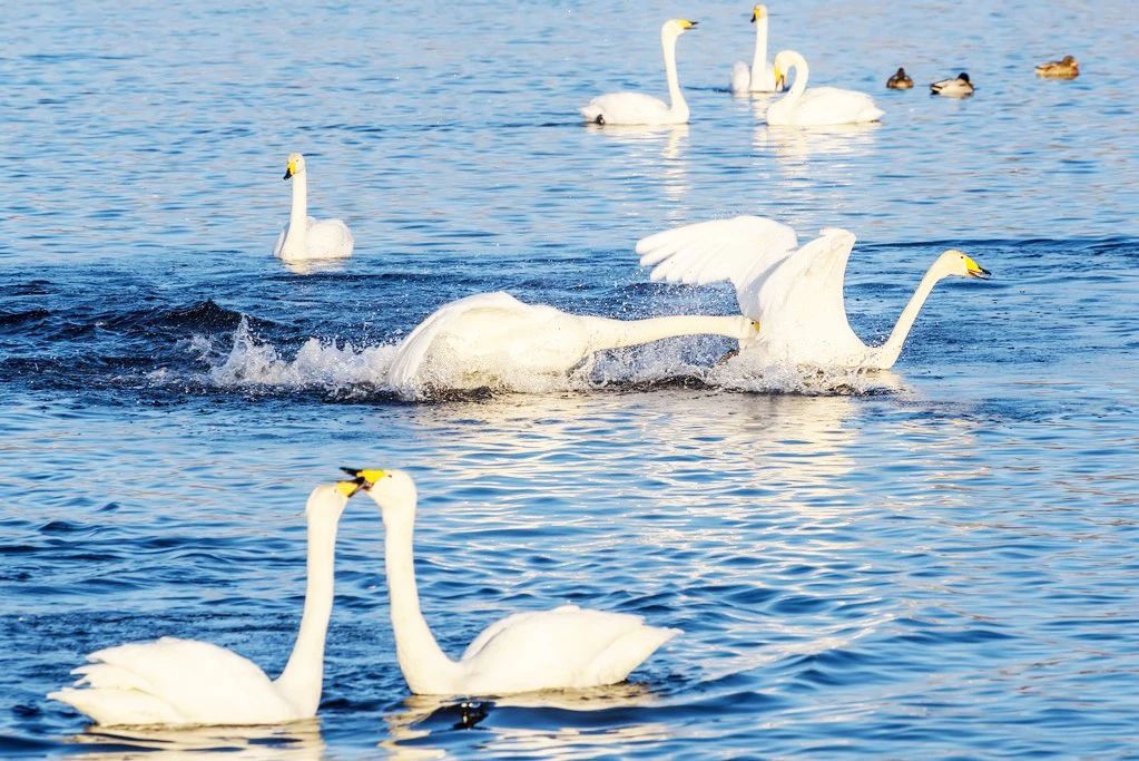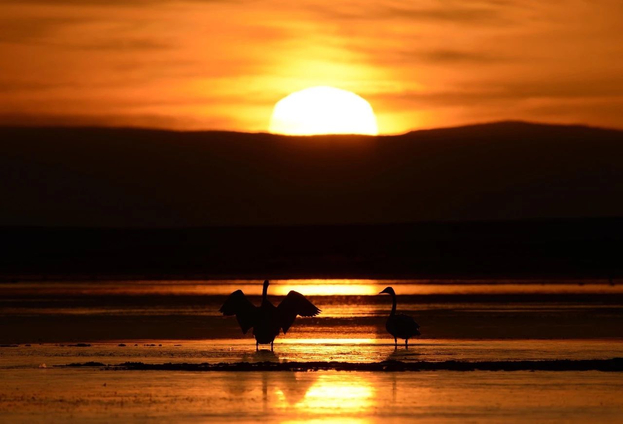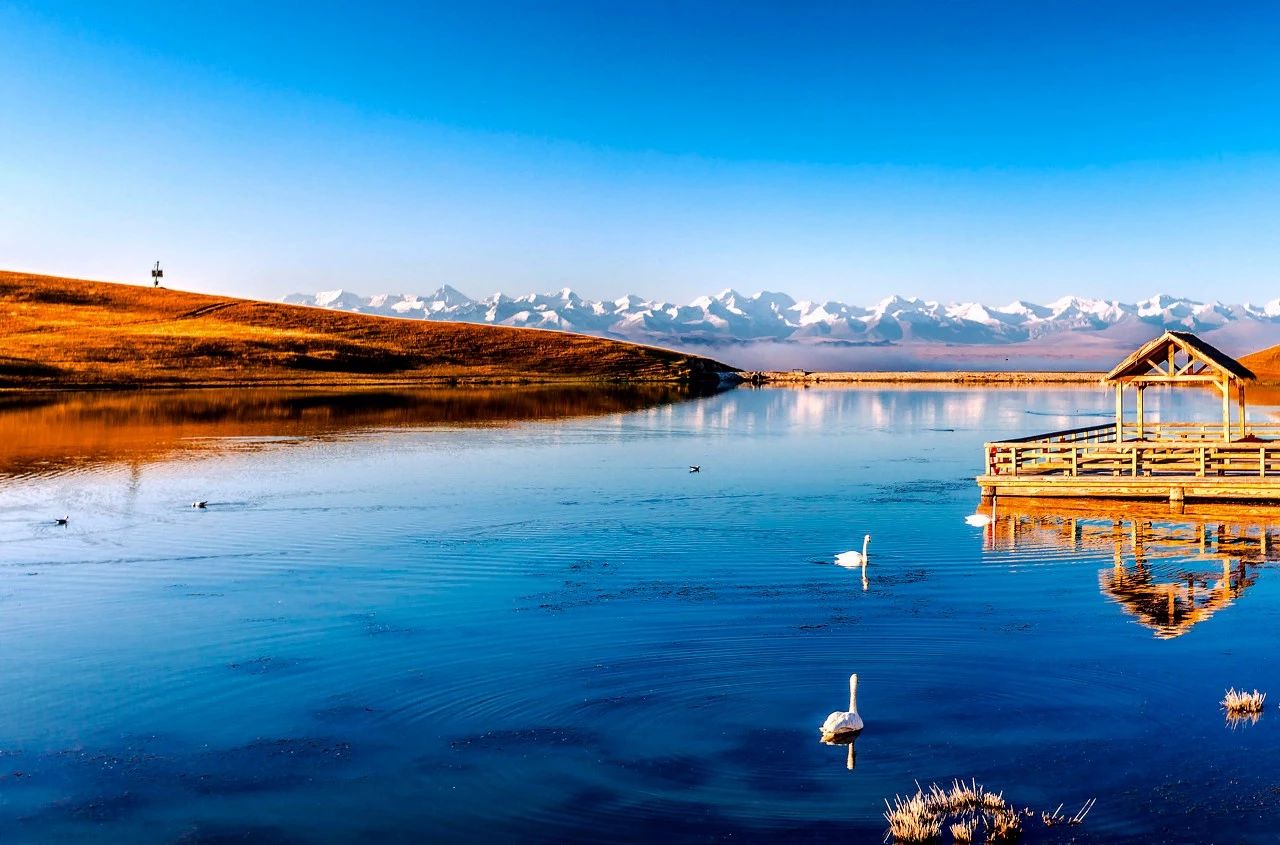 蓝色是是天鹅湖的颜色。如果说长河是巴音布鲁克草原上的琴弦,那么天鹅就是巴音布鲁克跳动的音符。一年四季,天鹅湖倒映着雪山、蓝天、白云,是天鹅的家乡,也是天堂。