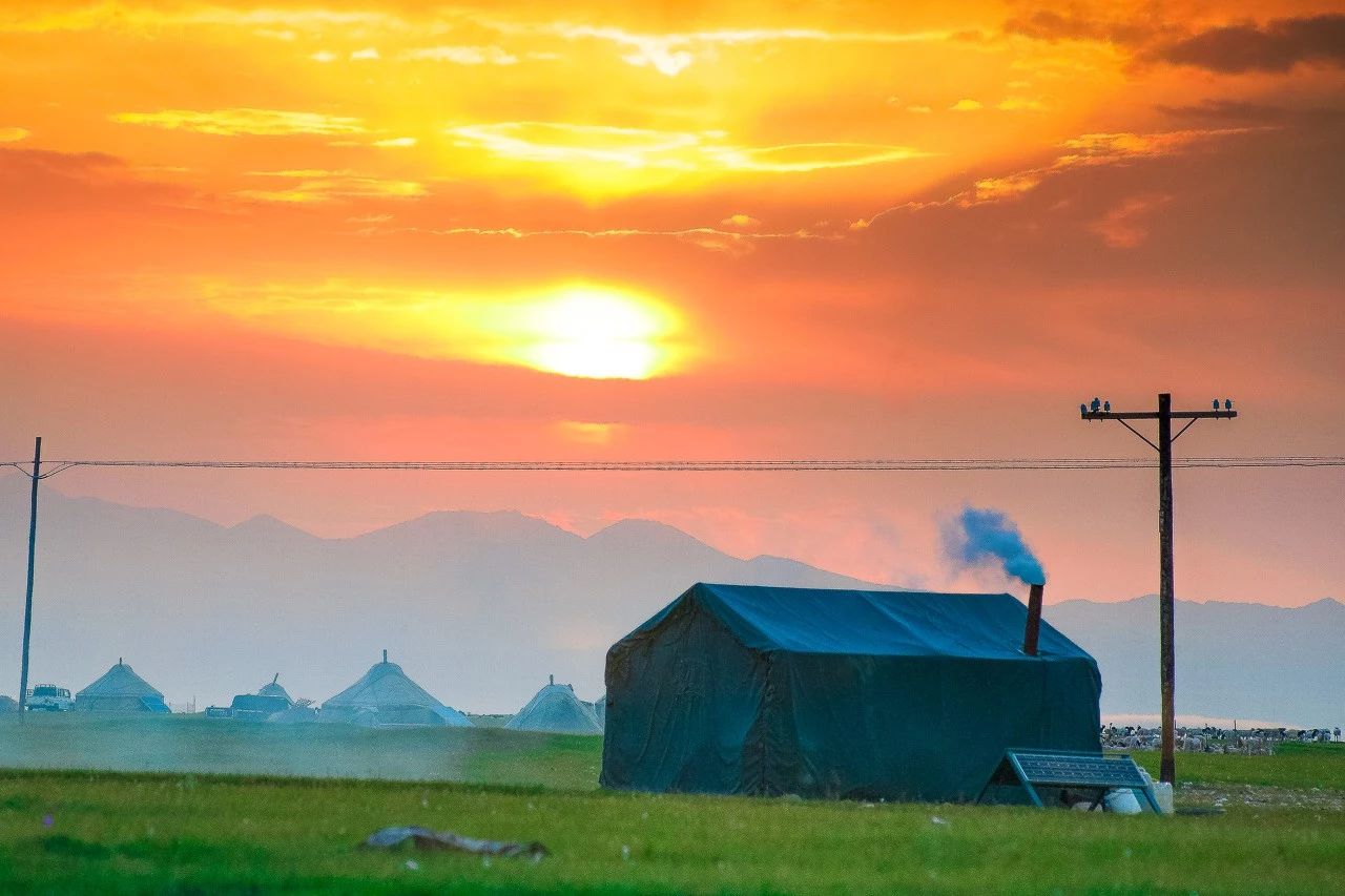 红色是草原日出的颜色,如果你去草原,我建议你等待一场草原的日出。和城市里的日出不一样,草原上有无限的广大被日出照亮。