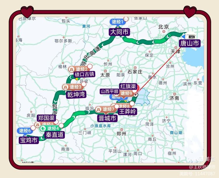 此行的大致路线是:唐山市→大同市→碛口古镇→乾坤湾→秦直道→郑国渠→陕西宝鸡→山西晋城→王莾岭风景区→太行大峡谷(红旗渠)→山西平顺(古寺庙)。计划用时一个月。