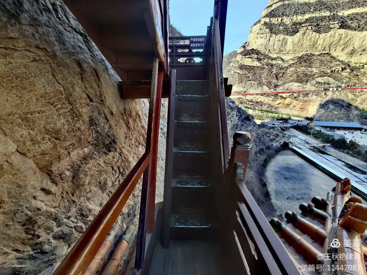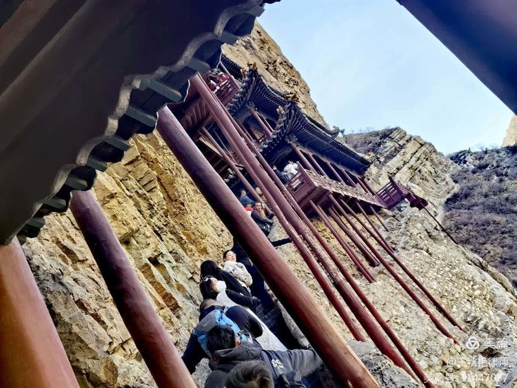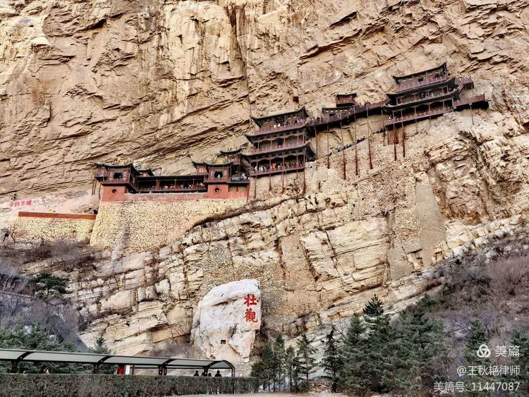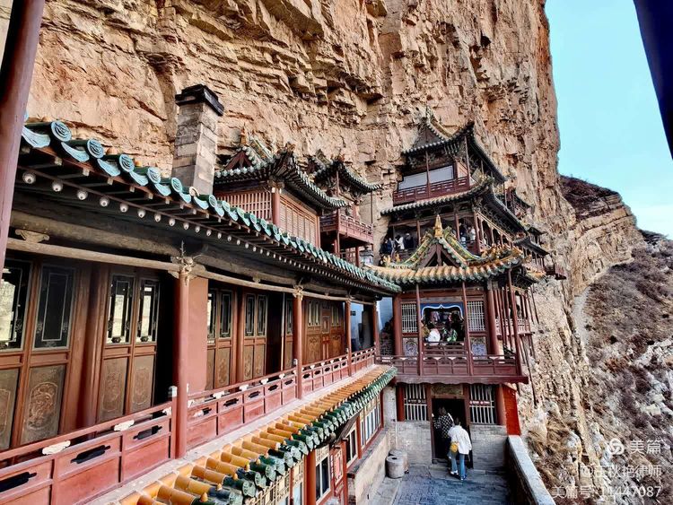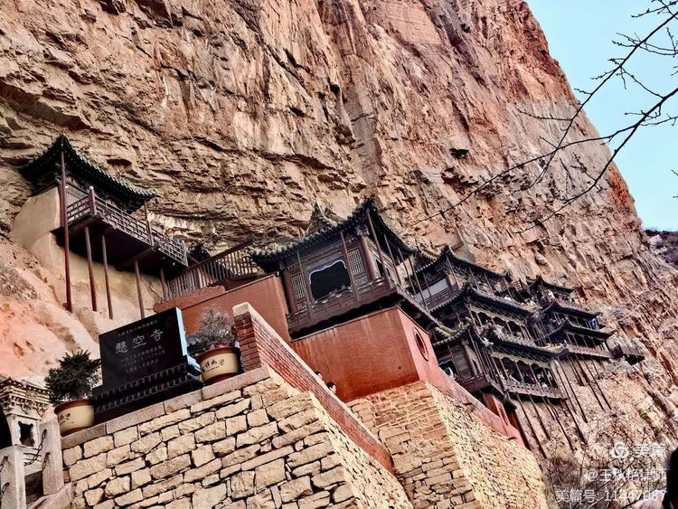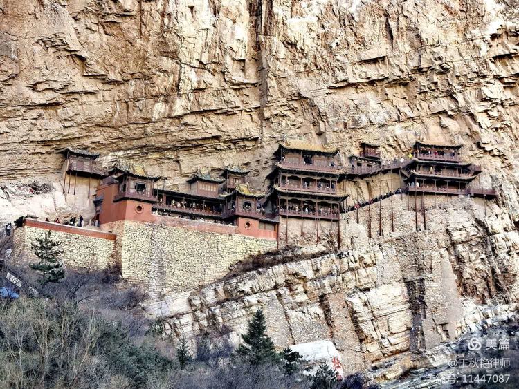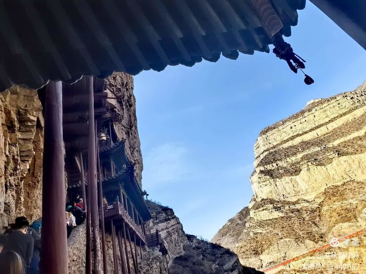 庙宇依照力学原理,巧借岩石暗托,凿洞插梁为基,梁柱上下相嵌,廊栏左右相连,下面支撑着一根根并不粗壮的松木。木结构的庙宇悬于半空,悬空寺即由此得名。