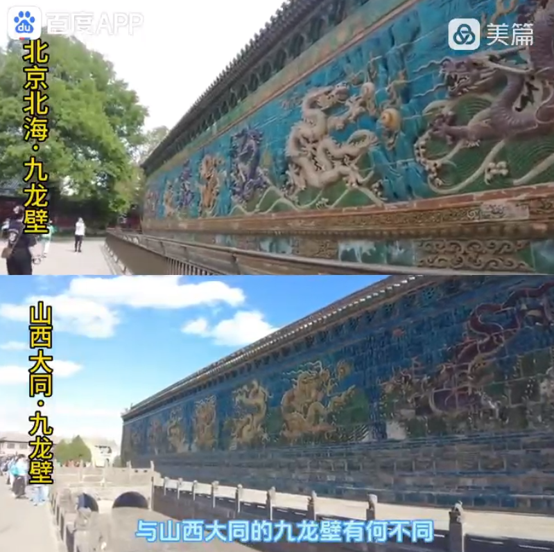 九龙壁始建于明代洪武二十五年(1392 年),原为代王府前的照壁。整座龙壁长45.5米,高8米,厚2米。由壁座、壁身和壁顶三部分组成。壁身用 426 块特制的五彩琉璃构件拼砌而成。大同九龙壁是我国现存规模最大,建筑年代最早的一座琉璃龙壁,比北海九龙壁大,而且时间上要早300多年。二者的对比,可以通过网络上的视频深入了解一下。