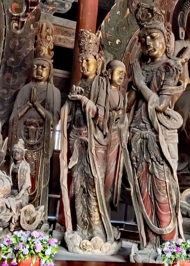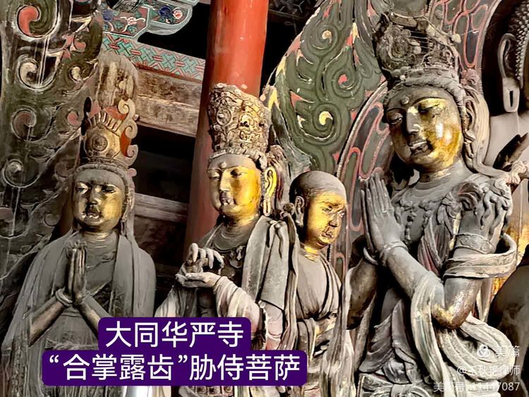 薄伽教藏殿内的泥质彩塑堪称辽代雕塑之精品,尤以一尊面带微笑的“合掌露齿”胁侍菩萨像最为生动,堪称“神品”。塑像高约两米,赤足站立在莲花台上,体态丰盈、上身薄袒、衣饰贴体、肘悬飘带、发束高冠、身姿略侧、颈项微斜、双目半睁、朱唇小开、两手合十、举至胸前、露齿微笑,被赋予“东方维纳斯”之雅号。