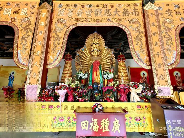 千手观音殿是明代建筑,内塑“十一面观音”像,菩萨头戴有十一个头面的宝冠,前面为圣菩萨面相,左边三面为愤怒相,右边三面为慈悲相,背后一面为大笑相,最顶上为阿弥陀佛化相。壁画千手千眼观音像,观世间一切事物,度一切众生,广大圆满,没有障碍。