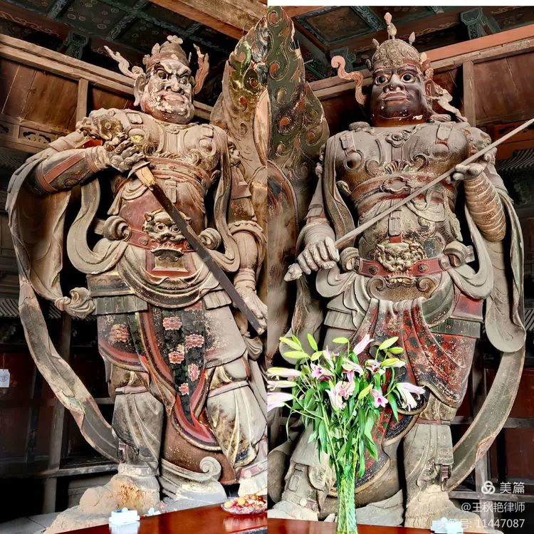 佛坛上的力士塑像,装束、表情、身形各异,足见雕塑技艺之高超。把一老一少拼在一起,留个纪念。