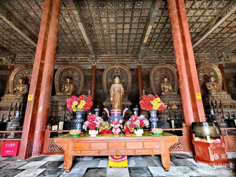 大雄宝殿内环殿壁画于清光绪十六年由大同本地画工董安等人绘制,共875.2平方米。殿顶平棋为明代宣德年间补装,在清代光绪初年重新彩绘,有1012块,纹饰无一雷同。
