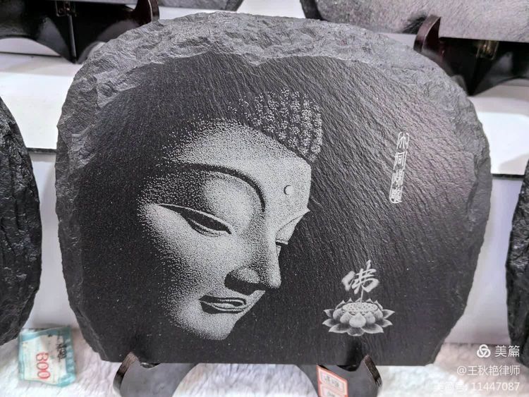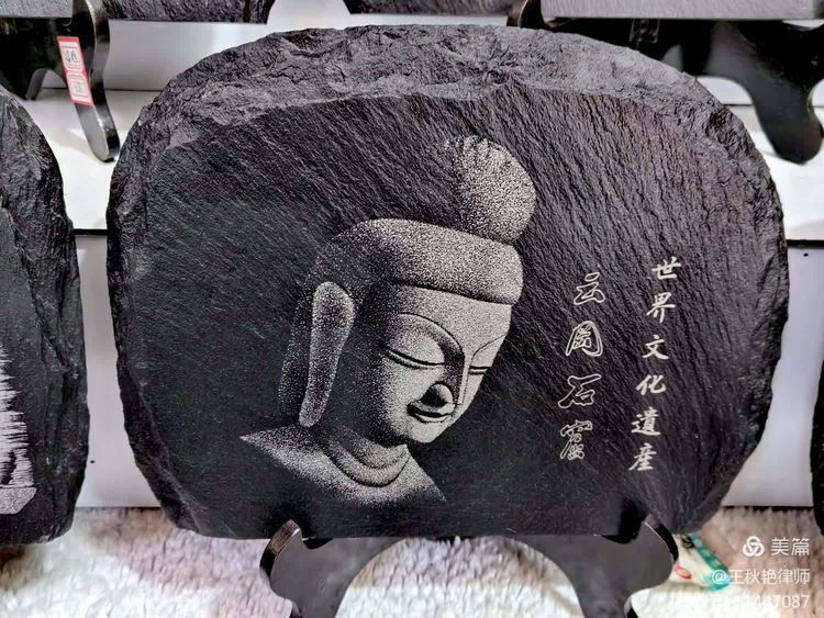 驻足欣赏的时候,目光被两幅以石窟内佛像为蓝本雕刻的小画吸引住了,那种低眉垂目的悲悯神情深深打动了我。本来决定不买纪念品的,最后花了180块钱,让师傅给小心包装了起来。
